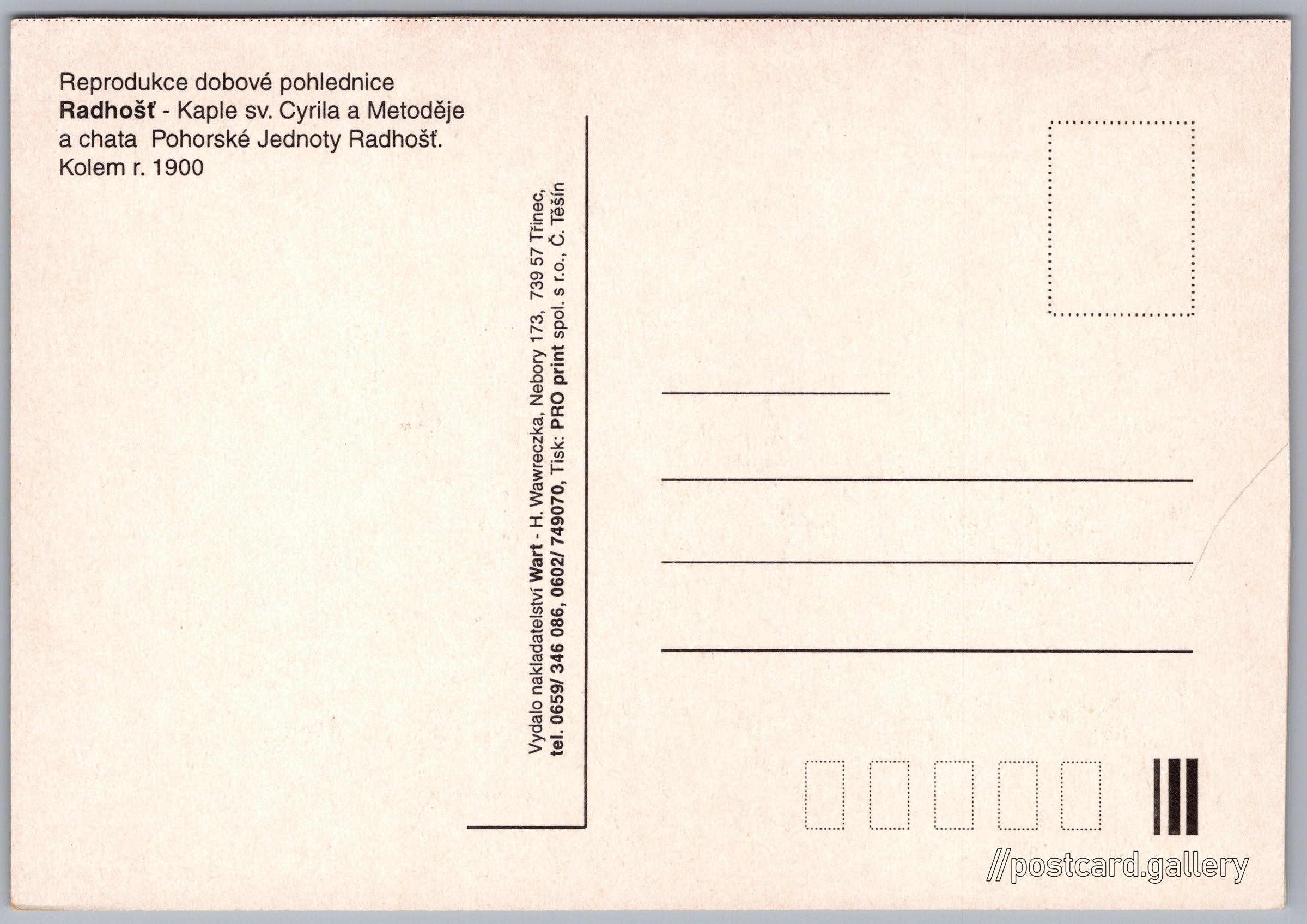 Pozdrav z Radhoště Pokud chcete vidět pohlednice ve vyšším rozlišení nebo zobrazovat jejich zadní stranu, tak se prosím nejdříve přihlašte Přihlásit Zaregistrovat Pozdrav z RadhoštěKaple s útulnouNákladem R Parmy ve Frenštátě r/R. Reprodukce dobové pohledniceRadhošť - Kaple sv. Cyrila a Metoděje a chata Pohorské Jednoty Radhošť. Jazyk tištěného textu na pohlednici: čeština Dolní Bečva 28, 756 55 Dolní Bečva, Czechia ukázat na mapě V blízkém okolí místa zobrazeného na pohlednici lze najít 31 jiných pohlednic. Zobrazit blízké pohlednice Vydavatel: Wart - H. Wareczka (Česko) Datum vydání není známo Pomozte nám odhadnout datum vzniku pohlednice Velikost (š x v) a tvar pohlednice: 151 x 106 mm (5.94" x 4.17"), obdélník Čistá pohlednice (neprošlá poštou) DiskuseVložit příspěvek Přidat novou složku ... Spravovat složky ...