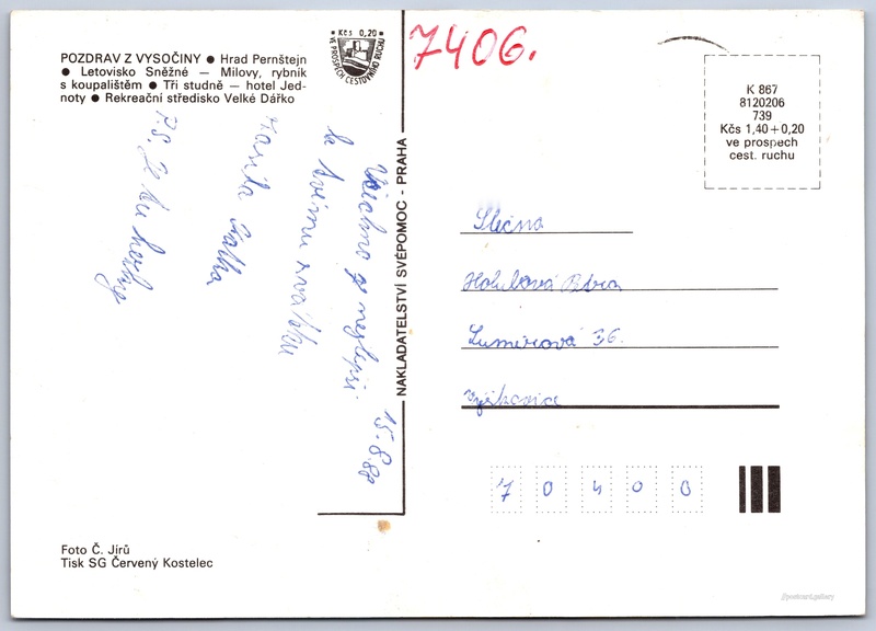 Pozdrav z Vysočiny Pokud chcete vidět pohlednice ve vyšším rozlišení nebo zobrazovat jejich zadní stranu, tak se prosím nejdříve přihlašte Přihlásit Zaregistrovat Pozdrav z Vysočiny POZDRAV Z VYSOČINY- Hrad Pernštejn- Letovisko Sněžné - Milovy, rybník s koupalištěm- Tři studně - hotel Jednoty- Rekreační středisko Velké Dářko Jazyk tištěného textu na pohlednici: čeština Hrad Pernštejn, Hrad, Pernštejn 13, Nedvědice - Pernštejn, Česko ukázat na mapě Vydavatel: Nakladatelství Svépomoc, Praha (Československo) Odhadované datum vydání pohlednice: 1985 - 1988 Pomozte nám zpřesnit rok vzniku pohlednice Velikost (š x v) a tvar pohlednice: 148 x 105 mm (5.83" x 4.13"), obdélník Osoby spjaté s touto pohlednicí: Čestmír Jírů(Autor fotografie) Prošlá poštou:Datum napsání pohledu: 15.8.1988 Ceny: Cena pohlednice: 1,40 Kčs (CSK) (+0,20 Kčs přípl. na tur. ruch) Kódy na pohlednici: K 867 8120206 739 DiskuseVložit příspěvek Přidat novou složku ... Spravovat složky ...