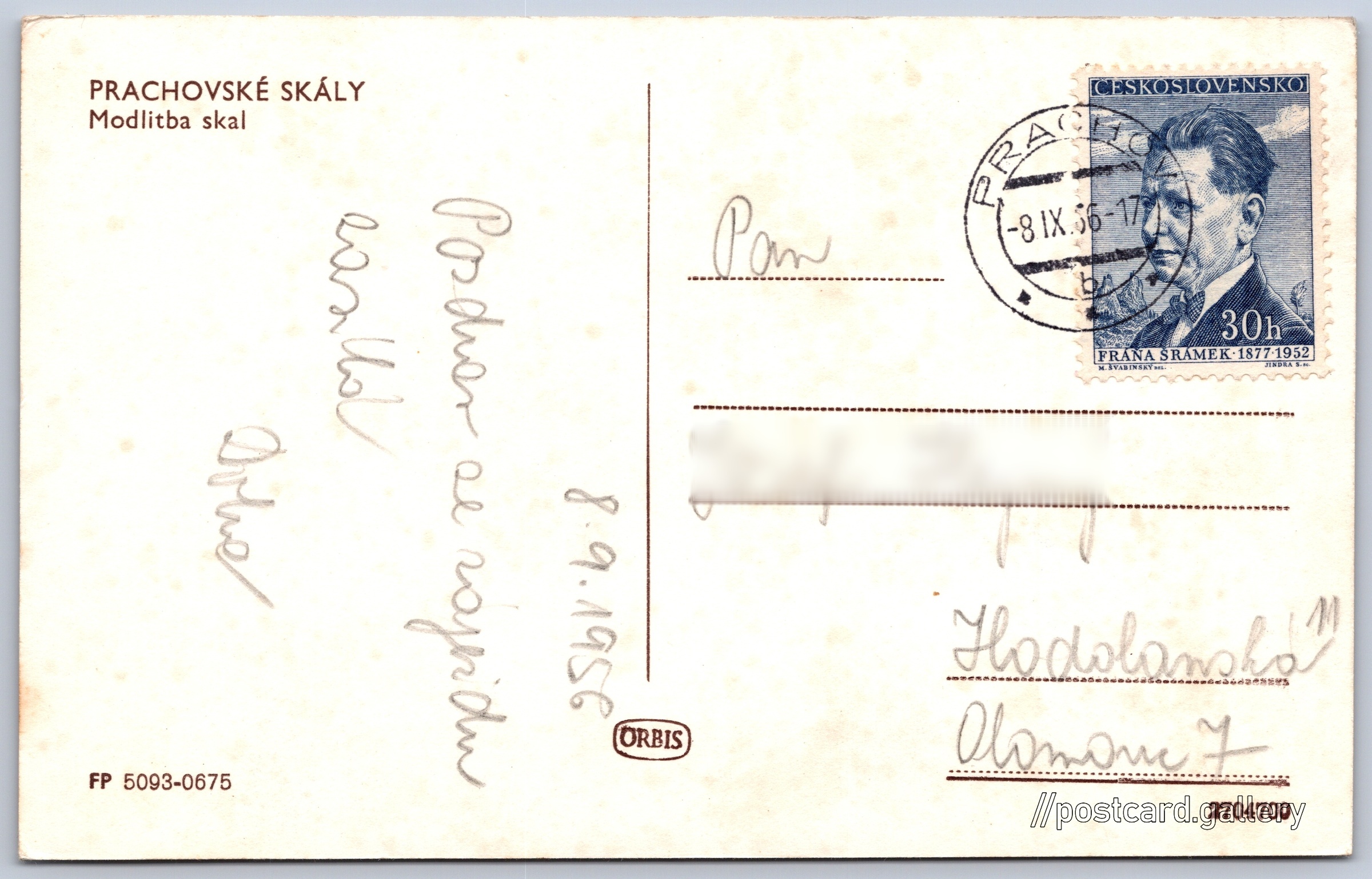 Prachovské skály, Modlitba skal Pokud chcete vidět pohlednice ve vyšším rozlišení nebo zobrazovat jejich zadní stranu, tak se prosím nejdříve přihlašte Přihlásit Zaregistrovat PRACHOVSKÉ SKÁLYModlitba skal Jazyk tištěného textu na pohlednici: čeština Skalní věž Mnich, Lezecký terén, Holín - Horní Lochov, Česko ukázat na mapě V blízkém okolí místa zobrazeného na pohlednici lze najít 13 jiných pohlednic. Zobrazit blízké pohlednice Vydavatel: Nakladatelství Orbis (Československo) Odhadované datum vydání pohlednice: 1953 - 1956 Pomozte nám zpřesnit rok vzniku pohlednice Velikost (š x v) a tvar pohlednice: 140 x 88 mm (5.51" x 3.46"), obdélník Prošlá poštou:Datum na razítku: 8.9.1956Datum napsání pohledu: 8.9.1956 Ceny: Vyplacené známky: 0,30 Kčs (CSK) Kódy na pohlednici: FP 5093-0675 2704700 DiskuseVložit příspěvek Přidat novou složku ... Spravovat složky ...