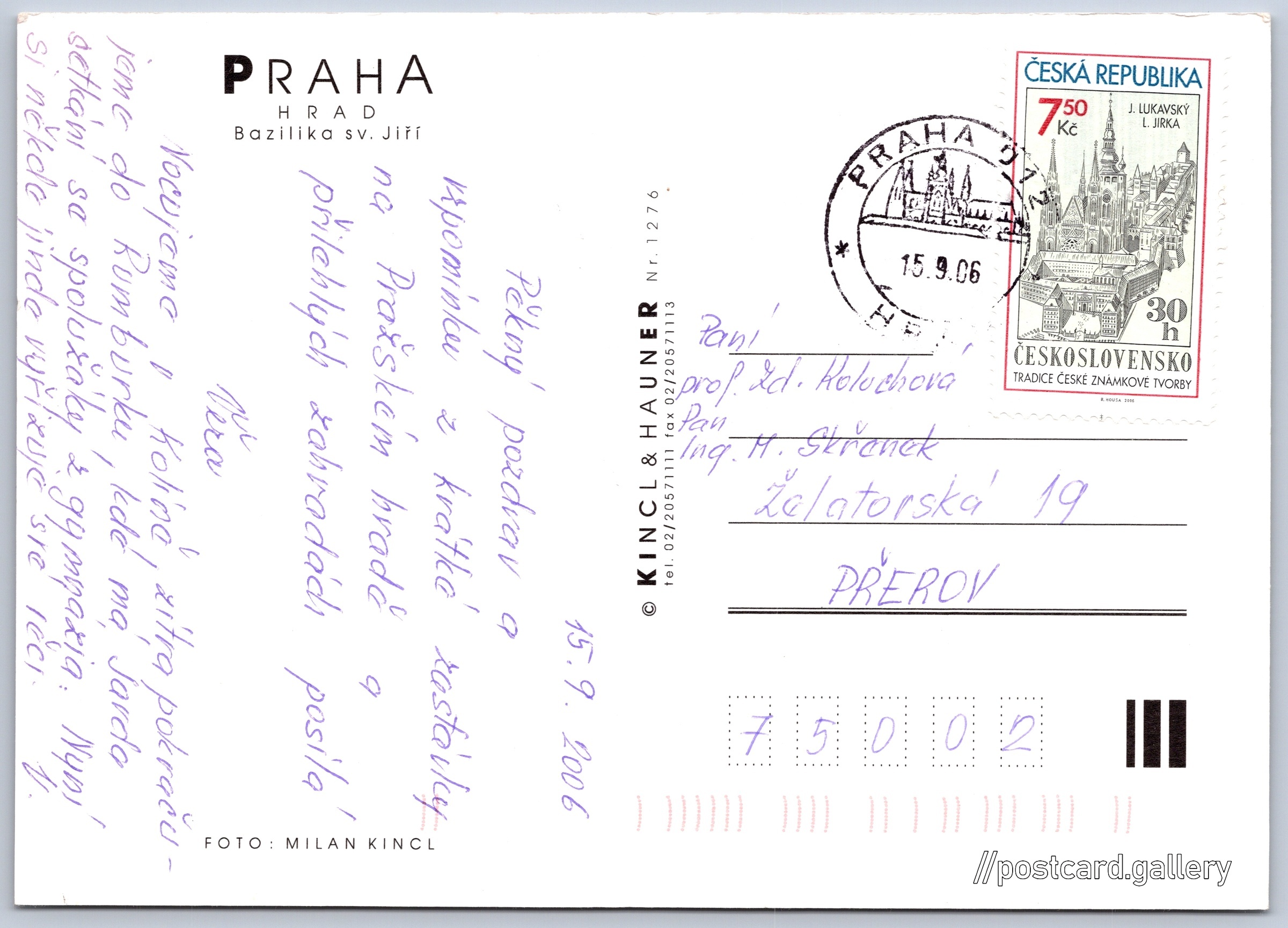 Praha, bazilika sv. Jiří Pokud chcete vidět pohlednice ve vyšším rozlišení nebo zobrazovat jejich zadní stranu, tak se prosím nejdříve přihlašte Přihlásit Zaregistrovat PrahaBazilika sv. Jiří PRAHAHRADBazilika sv. Jiří Jazyk tištěného textu na pohlednici: čeština Bazilika sv. Jiří, Kostel, Jiřská, Praha, Česko ukázat na mapě V blízkém okolí místa zobrazeného na pohlednici lze najít 159 jiných pohlednic. Zobrazit blízké pohlednice Vydavatel: Kincl & Hauner (Česko) Odhadované datum vydání pohlednice: 2003 - 2006 Pomozte nám zpřesnit rok vzniku pohlednice Velikost (š x v) a tvar pohlednice: 147 x 105 mm (5.79" x 4.13"), obdélník Osoby spjaté s touto pohlednicí: Milan Kincl(Autor fotografie) Prošlá poštou:Datum na razítku: 15.9.2006Datum napsání pohledu: 15.9.2006 Ceny: Vyplacené známky: 7,50 Kč (CZK) Kódy na pohlednici: 1276 DiskuseVložit příspěvek Přidat novou složku ... Spravovat složky ...