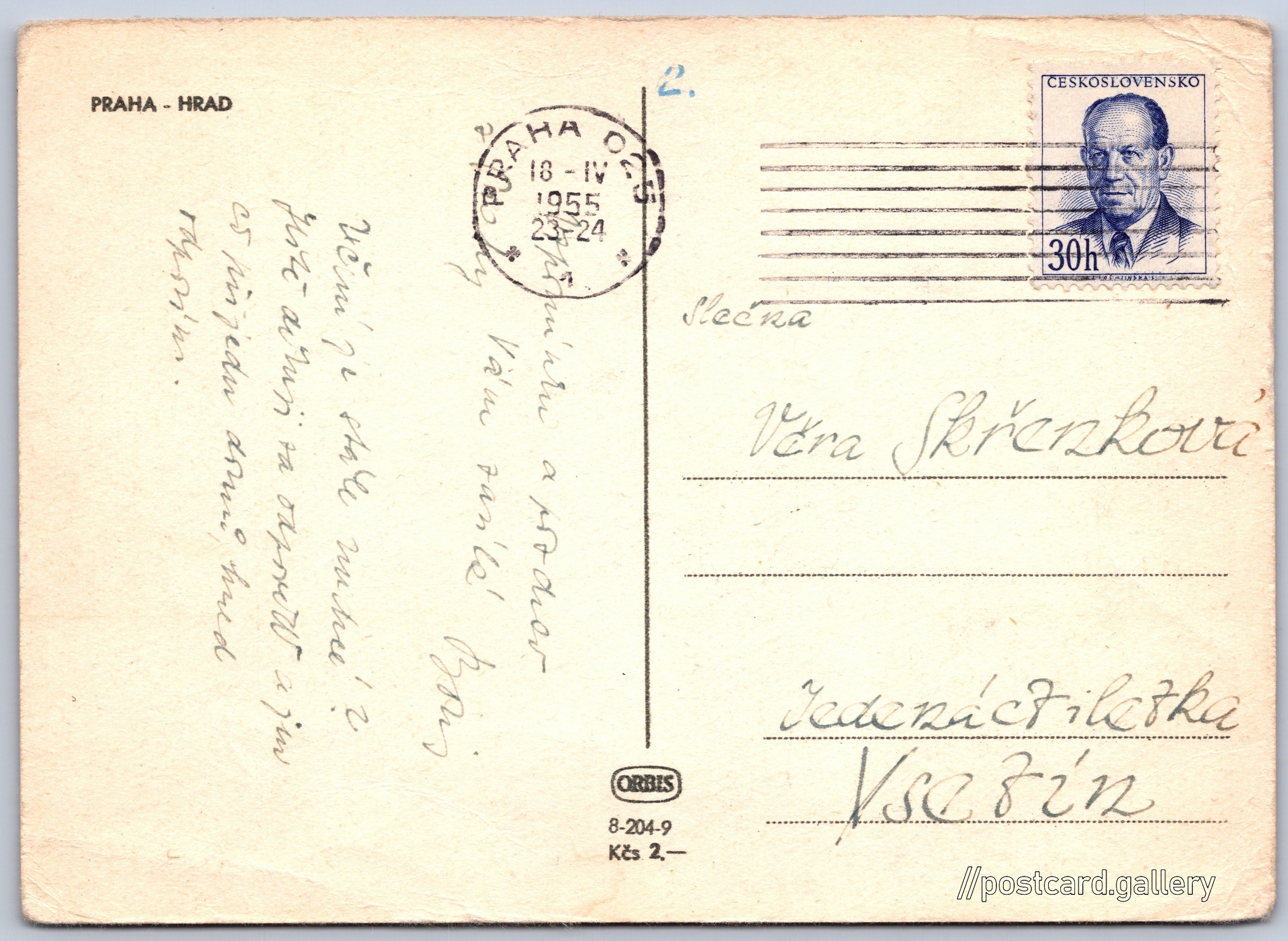 Praha, Hrad Pokud chcete vidět pohlednice ve vyšším rozlišení nebo zobrazovat jejich zadní stranu, tak se prosím nejdříve přihlašte Přihlásit Zaregistrovat PRAHA - HRAD Jazyk tištěného textu na pohlednici: čeština Alšovo nábřeží, Praha, Hlavní město Praha ukázat na mapě V blízkém okolí místa zobrazeného na pohlednici lze najít 159 jiných pohlednic. Zobrazit blízké pohlednice Vydavatel: Nakladatelství Orbis (Československo) Odhadované datum vydání pohlednice: 1952 - 1953 Pomozte nám zpřesnit rok vzniku pohlednice Velikost (š x v) a tvar pohlednice: 145 x 105 mm (5.71" x 4.13"), obdélník Prošlá poštou:Datum na razítku: 18.4.1955 Ceny: Cena pohlednice: 2,00 Kčs (CSK)Vyplacené známky: 0,30 Kčs (CSK) Kódy na pohlednici: 8-204-9 DiskuseVložit příspěvek Přidat novou složku ... Spravovat složky ...