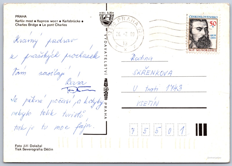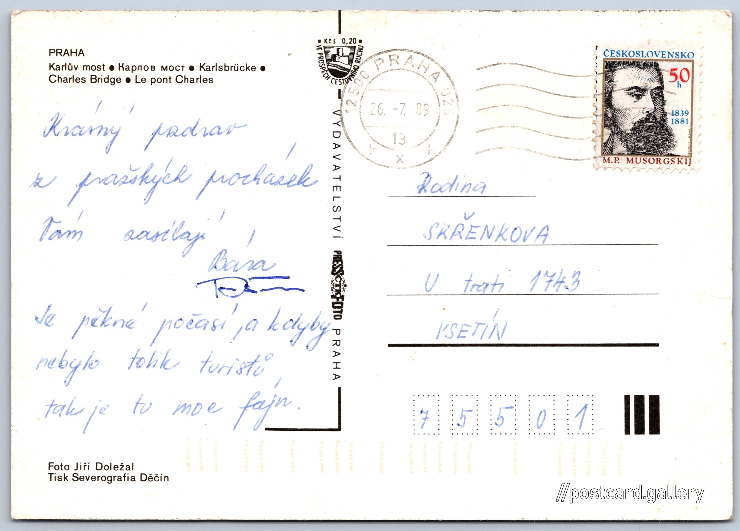 Praha, Karlův most 7/159 Pokud chcete vidět pohlednice ve vyšším rozlišení nebo zobrazovat jejich zadní stranu, tak se prosím nejdříve přihlašte Přihlásit Zaregistrovat PRAHA- Karlův most- Kарлов мост- Karlsbrücke.- Charles Bridge- Le pont Charles Jazyk tištěného textu na pohlednici: čeština Karlův most, Most, Karlův most, Praha, Česko ukázat na mapě V blízkém okolí místa zobrazeného na pohlednici lze najít 159 jiných pohlednic. Zobrazit blízké pohlednice Vydavatel: PressFoto Praha (Československo) Odhadované datum vydání pohlednice: 2006 - 2009 Pomozte nám zpřesnit rok vzniku pohlednice Velikost (š x v) a tvar pohlednice: 140 x 103 mm (5.51" x 4.06"), obdélník Osoby spjaté s touto pohlednicí: Jiří Doležal(Autor fotografie) Prošlá poštou:Datum na razítku: 26.7.1989 Ceny: Příplatek na tur. ruch: 0,20 Kčs (CSK))Vyplacené známky: 0,50 Kčs (CSK) DiskuseVložit příspěvek Přidat novou složku ... Spravovat složky ...