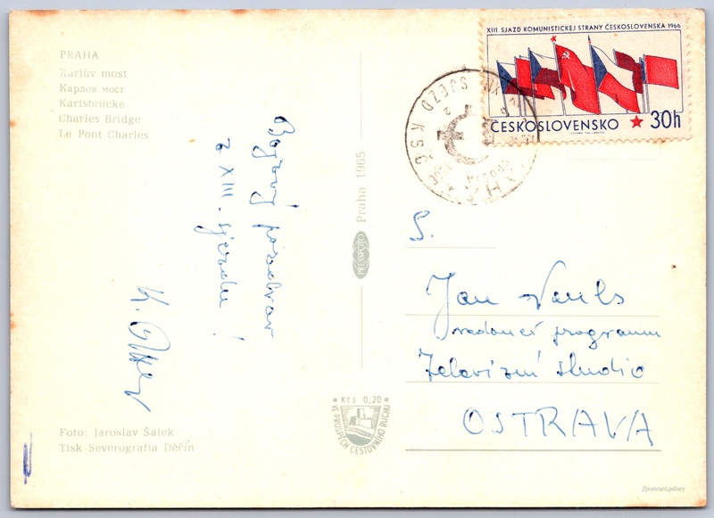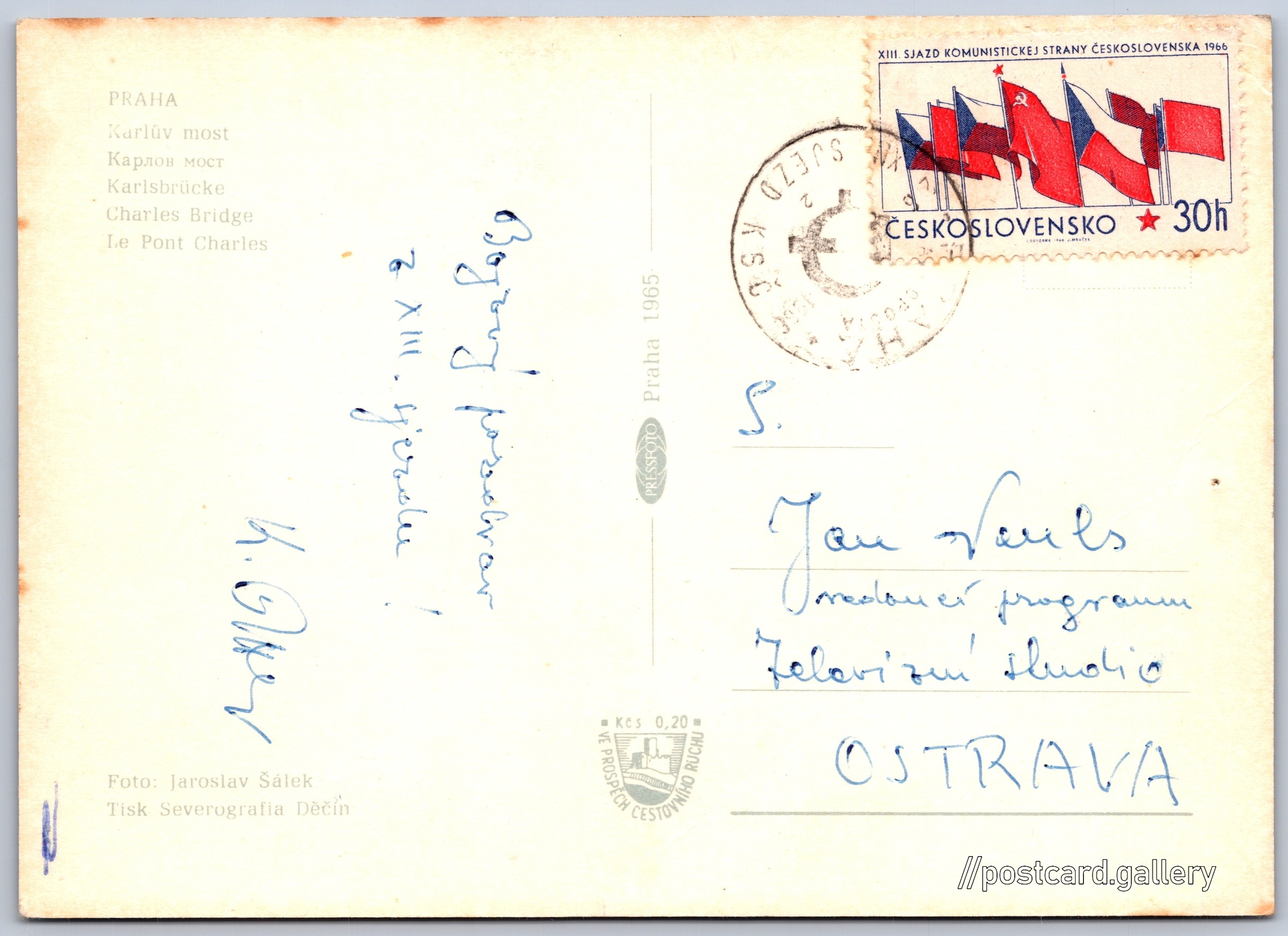 Praha, Karlův most 10/159 Pokud chcete vidět pohlednice ve vyšším rozlišení nebo zobrazovat jejich zadní stranu, tak se prosím nejdříve přihlašte Přihlásit Zaregistrovat PRAHA- Karlův most- Карлов мост- Karlsbrücke- Charles Bridge- Le Pont Charles Jazyky tištěného textu na pohlednici: čeština, ruština, němčina, angličtina, francouzština, francouzština Karlův most, Praha, Hlavní město Praha ukázat na mapě V blízkém okolí místa zobrazeného na pohlednici lze najít 159 jiných pohlednic. Zobrazit blízké pohlednice Vydavatel: PressFoto Praha (Československo) Rok vydání pohlednice: 1965 Velikost (š x v) a tvar pohlednice: 147 x 105 mm (5.79" x 4.13"), obdélník Osoby spjaté s touto pohlednicí: Jaroslav Šálek(Autor fotografie) Prošlá poštou Ceny: Příplatek na tur. ruch: 0,20 Kčs (CSK))Vyplacené známky: 0,30 Kčs (CSK) DiskuseVložit příspěvek Přidat novou složku ... Spravovat složky ...