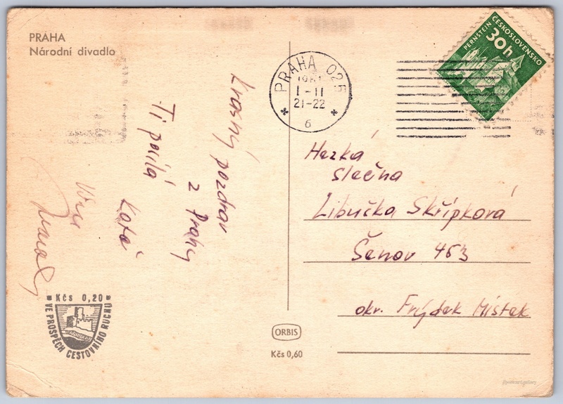 Praha, Národní divadlo 6/159 Pokud chcete vidět pohlednice ve vyšším rozlišení nebo zobrazovat jejich zadní stranu, tak se prosím nejdříve přihlašte Přihlásit Zaregistrovat PRAHANárodní divadlo Jazyk tištěného textu na pohlednici: čeština Masarykovo nábřeží 223/42, Praha, 110 00, Hlavní město Praha ukázat na mapě V blízkém okolí místa zobrazeného na pohlednici lze najít 159 jiných pohlednic. Zobrazit blízké pohlednice Vydavatel: Nakladatelství Orbis (Československo) Odhadované datum vydání pohlednice: 1958 - 1961 Pomozte nám zpřesnit rok vzniku pohlednice Velikost (š x v) a tvar pohlednice: 147 x 104 mm (5.79" x 4.09"), obdélník Prošlá poštou:Datum na razítku: 1.2.1961 Ceny: Cena pohlednice: 0,60 Kčs (CSK) (+0,20 Kčs přípl. na tur. ruch)Vyplacené známky: 0,30 Kčs (CSK) DiskuseVložit příspěvek Přidat novou složku ... Spravovat složky ...
