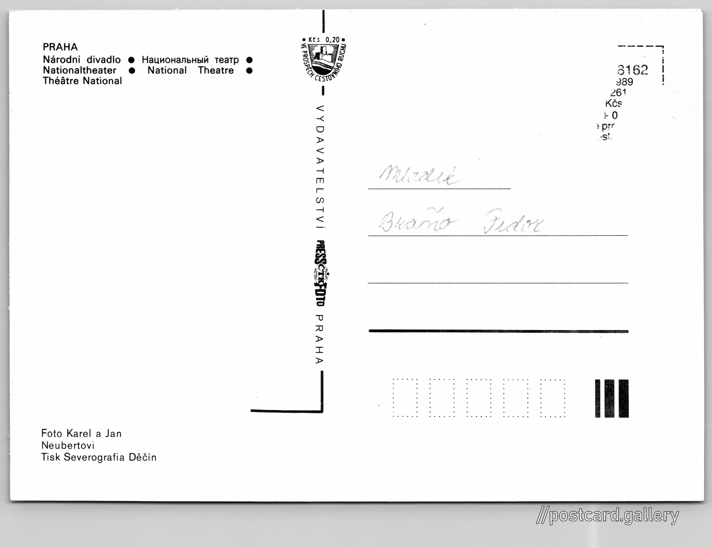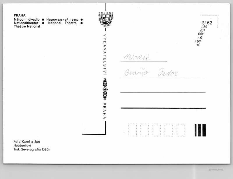 Praha, Národní divadlo Pokud chcete vidět pohlednice ve vyšším rozlišení nebo zobrazovat jejich zadní stranu, tak se prosím nejdříve přihlašte Přihlásit Zaregistrovat PRAHA- Národni divadlo- Национальный театр- Nationaltheater- National Theatre- Théâtre National Jazyky tištěného textu na pohlednici: čeština, ruština, němčina, angličtina, francouzština, francouzština Národní divadlo, Historická budova, Národní 223/2, Praha 1 - Nové Město, Česko ukázat na mapě V blízkém okolí místa zobrazeného na pohlednici lze najít 159 jiných pohlednic. Zobrazit blízké pohlednice Vydavatel: PressFoto Praha (Československo) Rok vydání pohlednice: 1989 Velikost (š x v) a tvar pohlednice: 148 x 105 mm (5.83" x 4.13"), obdélník Osoby spjaté s touto pohlednicí: Karel Neubert(Autor fotografie) Jan Neubert(Autor fotografie) Čistá pohlednice (neprošlá poštou) Ceny: Příplatek na tur. ruch: 0,20 Kčs (CSK)) DiskuseVložit příspěvek Přidat novou složku ... Spravovat složky ...