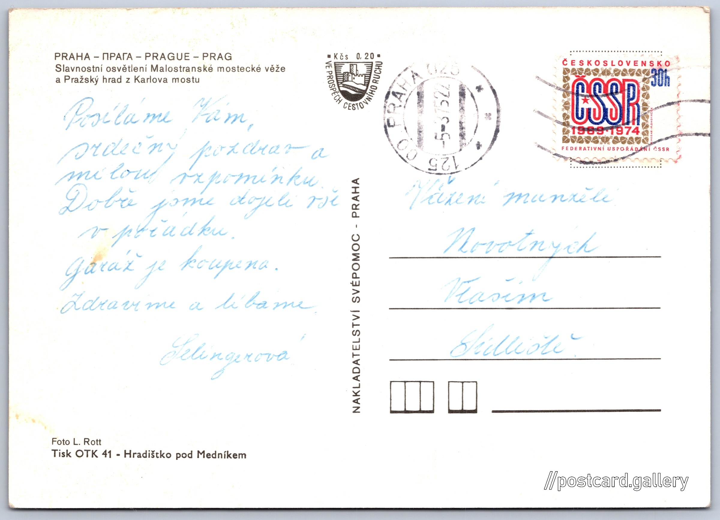 Praha, nasvětlení Malostranské mostecké věže Pokud chcete vidět pohlednice ve vyšším rozlišení nebo zobrazovat jejich zadní stranu, tak se prosím nejdříve přihlašte Přihlásit Zaregistrovat Praha PRAHA - ПРАгА - PRAGUE - PRAGSlavnostní osvětlení Malostranské mostecké věžea Pražský hrad z Karlova mostu Jazyky tištěného textu na pohlednici: čeština, ruština, angličtina, němčina Malostranské mostecké věže, Hradby, opevnění, Malá Strana 57, Praha 1 - Malá Strana, Česko ukázat na mapě V blízkém okolí místa zobrazeného na pohlednici lze najít 159 jiných pohlednic. Zobrazit blízké pohlednice Vydavatel: Nakladatelství Svépomoc, Praha (Československo) Odhadované datum vydání pohlednice: 1972 - 1975 Pomozte nám zpřesnit rok vzniku pohlednice Velikost (š x v) a tvar pohlednice: 148 x 105 mm (5.83" x 4.13"), obdélník Osoby spjaté s touto pohlednicí: Lumír Rott(Autor fotografie) Prošlá poštou:Datum na razítku: 5.3.1975 Ceny: Příplatek na tur. ruch: 0,20 Kčs (CSK))Vyplacené známky: 0,30 Kčs (CSK) DiskuseVložit příspěvek Přidat novou složku ... Spravovat složky ...