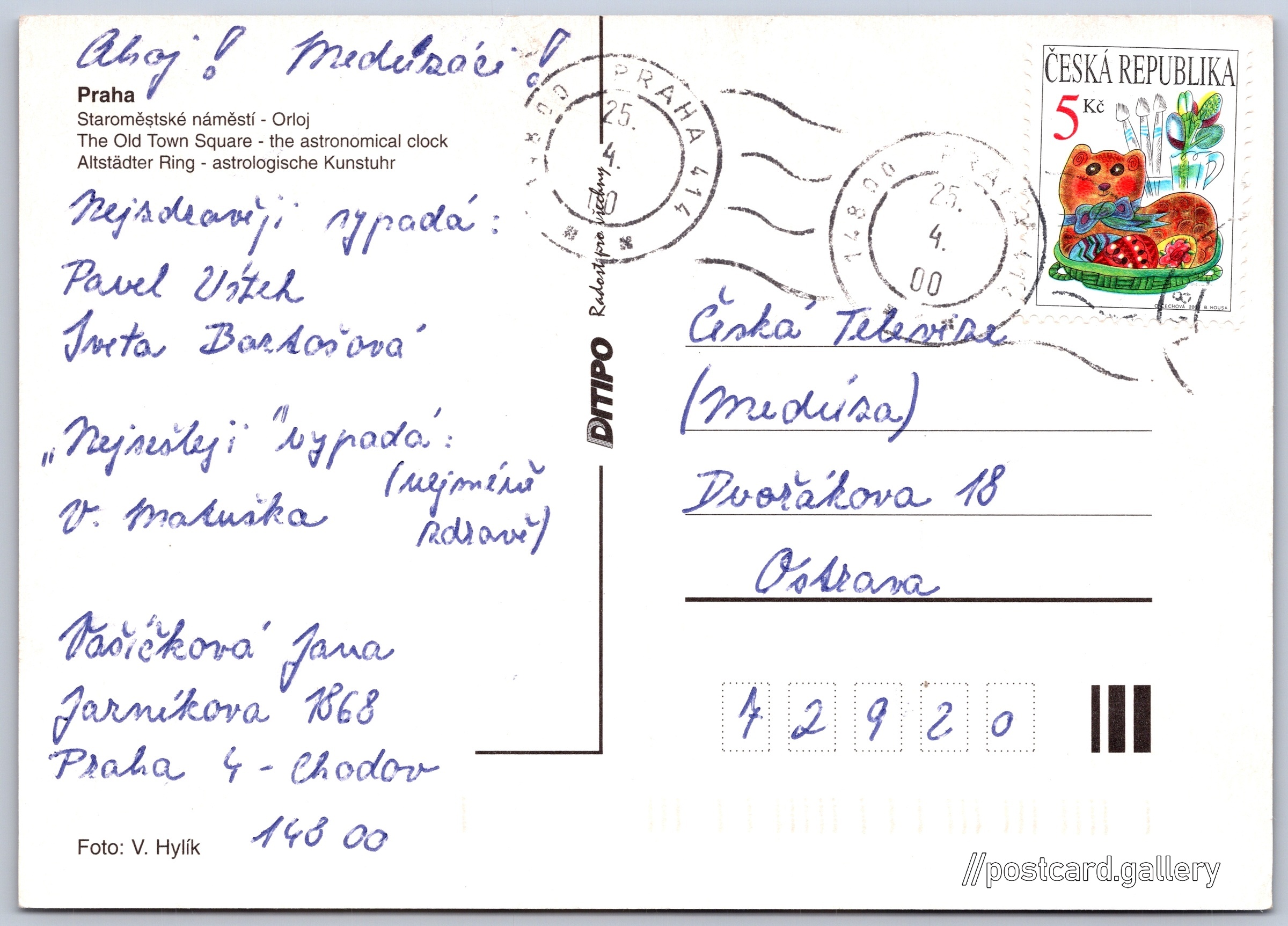 Praha, Orloj Pokud chcete vidět pohlednice ve vyšším rozlišení nebo zobrazovat jejich zadní stranu, tak se prosím nejdříve přihlašte Přihlásit Zaregistrovat Praha- Staroměstské náměstí - Orloj- The Old Town Square - the astronomical clock- Altstädter Ring - astrologische Kunstuhr Jazyky tištěného textu na pohlednici: čeština, angličtina, němčina Staroměstský orloj, Jiná zajímavost , Staroměstské náměstí 1/4, Praha 1 - Staré Město, Česko ukázat na mapě V blízkém okolí místa zobrazeného na pohlednici lze najít 159 jiných pohlednic. Zobrazit blízké pohlednice Vydavatel: Ditipo (Česko) Odhadované datum vydání pohlednice: 1997 - 2000 Pomozte nám zpřesnit rok vzniku pohlednice Velikost (š x v) a tvar pohlednice: 147 x 105 mm (5.79" x 4.13"), obdélník Osoby spjaté s touto pohlednicí: V. Hylík(Autor fotografie) Prošlá poštou:Datum na razítku: 25.4.2000 Ceny: Vyplacené známky: 5,00 Kč (CZK) DiskuseVložit příspěvek Přidat novou složku ... Spravovat složky ...
