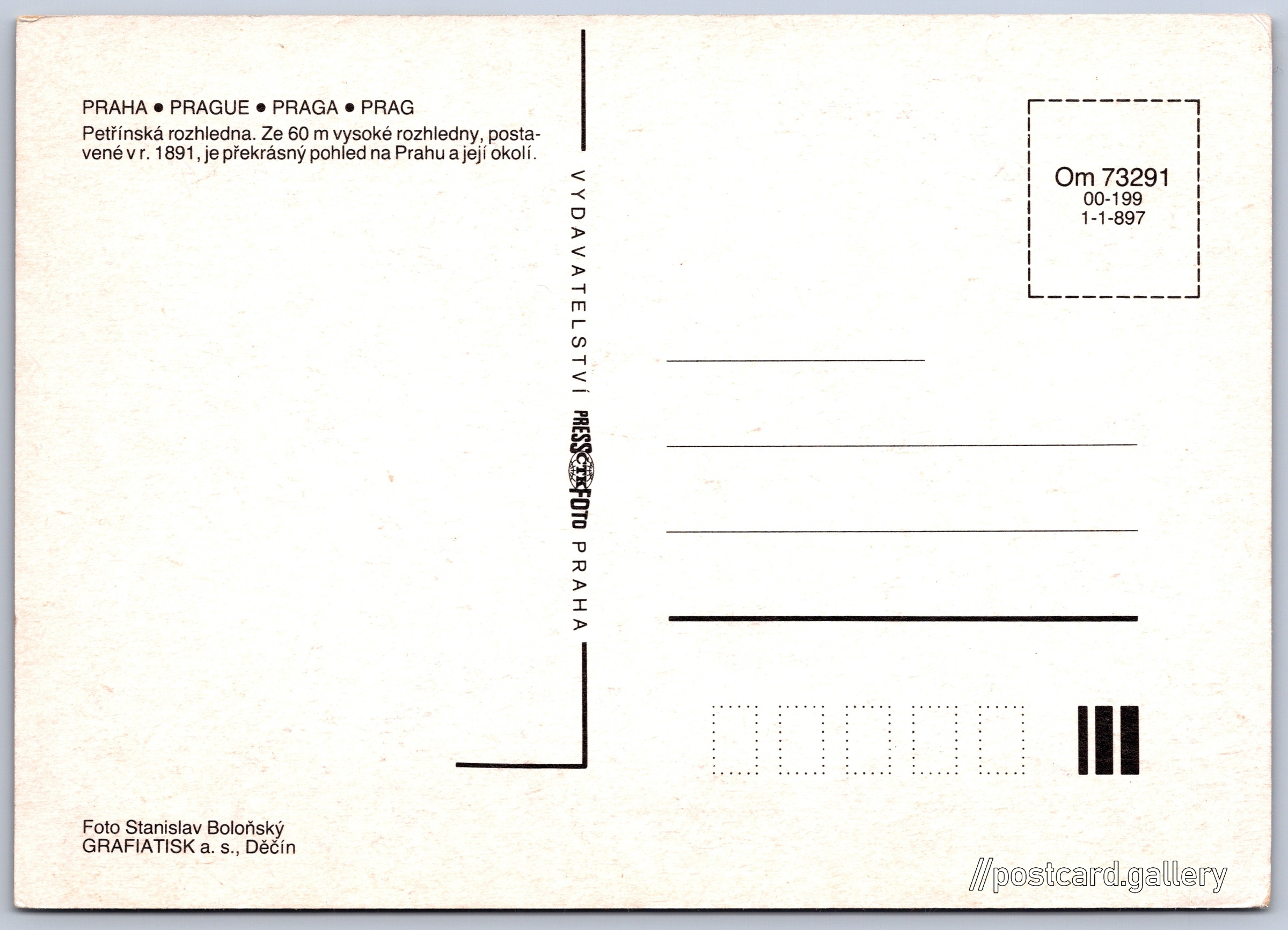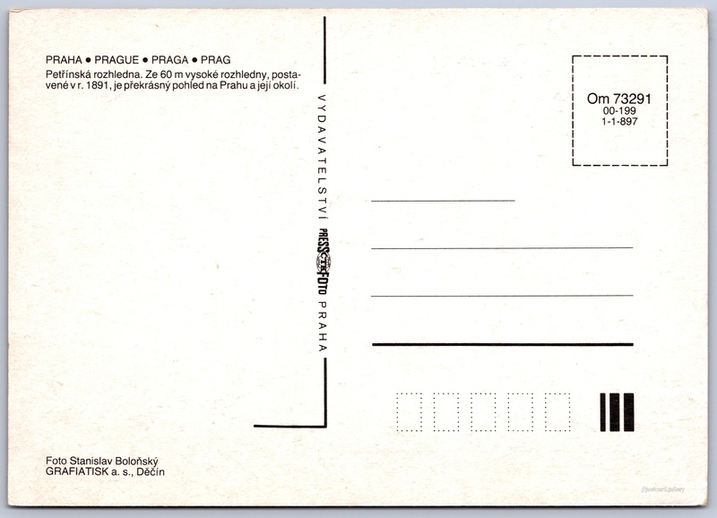 Praha, Petřínská rozhledna Pokud chcete vidět pohlednice ve vyšším rozlišení nebo zobrazovat jejich zadní stranu, tak se prosím nejdříve přihlašte Přihlásit Zaregistrovat PRAHA - PRAGUE - PRAGA - PRAGPetřínská rozhledna. Ze 60 m vysoké rozhledny, postavené v r. 1891, je překrásný pohled na Prahu a její okolí. Jazyky tištěného textu na pohlednici: čeština, angličtina, francouzština, němčina Petřínská rozhledna, Rozhledna, Petřínské sady 633, Praha 1 - Malá Strana, Česko ukázat na mapě V blízkém okolí místa zobrazeného na pohlednici lze najít 159 jiných pohlednic. Zobrazit blízké pohlednice Vydavatel: PressFoto Praha (Československo) Rok vydání pohlednice: 1991 Velikost (š x v) a tvar pohlednice: 147 x 105 mm (5.79" x 4.13"), obdélník Osoby spjaté s touto pohlednicí: Stanislav Boloňský(Autor fotografie) Čistá pohlednice (neprošlá poštou) Kódy na pohlednici: Om 73291 00-199 1-1-897 DiskuseVložit příspěvek Přidat novou složku ... Spravovat složky ...