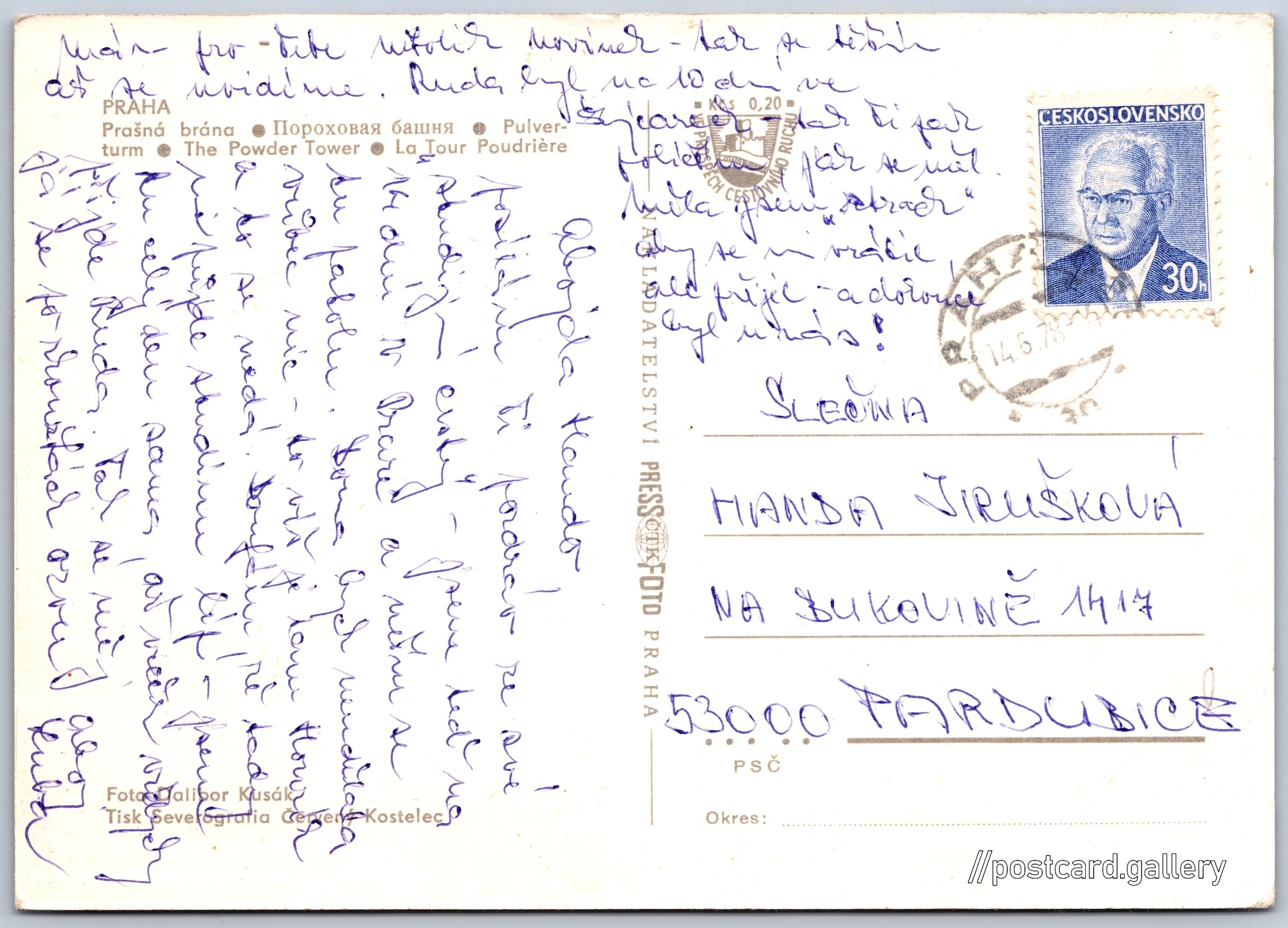 Praha, Prašná brána Pokud chcete vidět pohlednice ve vyšším rozlišení nebo zobrazovat jejich zadní stranu, tak se prosím nejdříve přihlašte Přihlásit Zaregistrovat PRAHA- Prašná brána- Пороховая башня- Pulverturm- The Powder Tower- La Tour Poudrière Jazyky tištěného textu na pohlednici: čeština, ruština, němčina, angličtina, francouzština, francouzština Na Příkopě 864/28, Praha, 110 00, Hlavní město Praha ukázat na mapě V blízkém okolí místa zobrazeného na pohlednici lze najít 159 jiných pohlednic. Zobrazit blízké pohlednice Vydavatel: PressFoto Praha (Československo) Odhadované datum vydání pohlednice: 1975 - 1978 Pomozte nám zpřesnit rok vzniku pohlednice Velikost (š x v) a tvar pohlednice: 147 x 104 mm (5.79" x 4.09"), obdélník Osoby spjaté s touto pohlednicí: Dalibor Kusák(Autor fotografie) Prošlá poštou:Datum na razítku: 14.6.1978 Ceny: Příplatek na tur. ruch: 0,20 Kčs (CSK))Vyplacené známky: 0,30 Kčs (CSK) DiskuseVložit příspěvek Přidat novou složku ... Spravovat složky ...