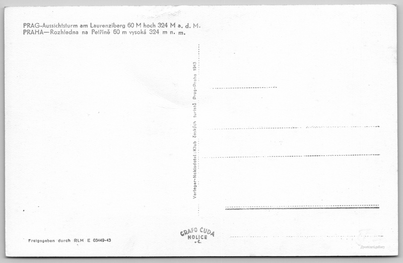 Praha, rozhledna na Petříně Pokud chcete vidět pohlednice ve vyšším rozlišení nebo zobrazovat jejich zadní stranu, tak se prosím nejdříve přihlašte Přihlásit Zaregistrovat PRAG - Aussichtsturm am Laurenziberg 60 M hoch 324 M a. d. M.PRAHA - Rozhledna na Petříně 60 m vysoká 324 m n. m.Freigegeben durch RLM E 03449-43 Jazyky tištěného textu na pohlednici: němčina, čeština Petřínská rozhledna, Rozhledna, Petřínské sady 633, Praha 1 - Malá Strana, Česko ukázat na mapě V blízkém okolí místa zobrazeného na pohlednici lze najít 159 jiných pohlednic. Zobrazit blízké pohlednice Vydavatel: Grafo Čuda Holice (Československo)Klub českých turistů (Československo) Rok vydání pohlednice: 1943 Velikost (š x v) a tvar pohlednice: 137 x 88 mm (5.39" x 3.46"), obdélník Čistá pohlednice (neprošlá poštou) Kódy na pohlednici: E 03449-43 DiskuseVložit příspěvek Přidat novou složku ... Spravovat složky ...