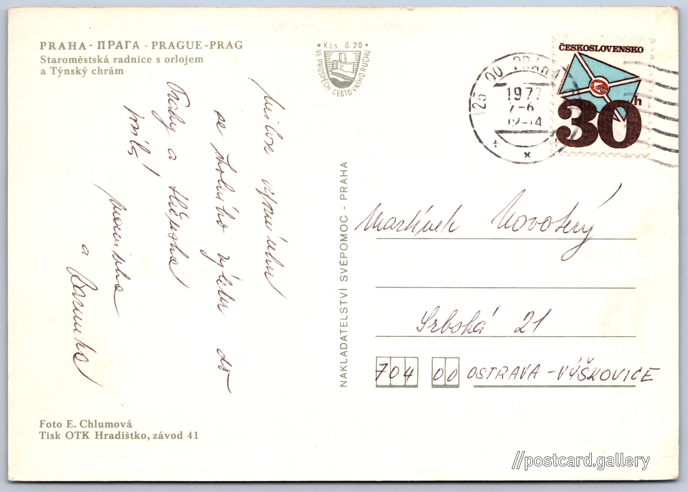 Praha, Staroměstská radnice 7/159 Pokud chcete vidět pohlednice ve vyšším rozlišení nebo zobrazovat jejich zadní stranu, tak se prosím nejdříve přihlašte Přihlásit Zaregistrovat Praha PRAHA - PRAGUE - PRAGStaroměstská radnice s orlojem a Týnský chrám Jazyk tištěného textu na pohlednici: čeština Staroměstská radnice s orlojem, Historická budova, Staroměstské náměstí 1/4, Praha 1 - Staré Město, Česko ukázat na mapě V blízkém okolí místa zobrazeného na pohlednici lze najít 159 jiných pohlednic. Zobrazit blízké pohlednice Vydavatel: Nakladatelství Svépomoc, Praha (Československo) Odhadované datum vydání pohlednice: 1974 - 1977 Pomozte nám zpřesnit rok vzniku pohlednice Velikost (š x v) a tvar pohlednice: 148 x 104 mm (5.83" x 4.09"), obdélník Osoby spjaté s touto pohlednicí: E. Chlumová(Autor fotografie) Prošlá poštou:Datum na razítku: 7.6.1977 Ceny: Příplatek na tur. ruch: 0,20 Kčs (CSK))Vyplacené známky: 0,30 Kčs (CSK) DiskuseVložit příspěvek Přidat novou složku ... Spravovat složky ...
