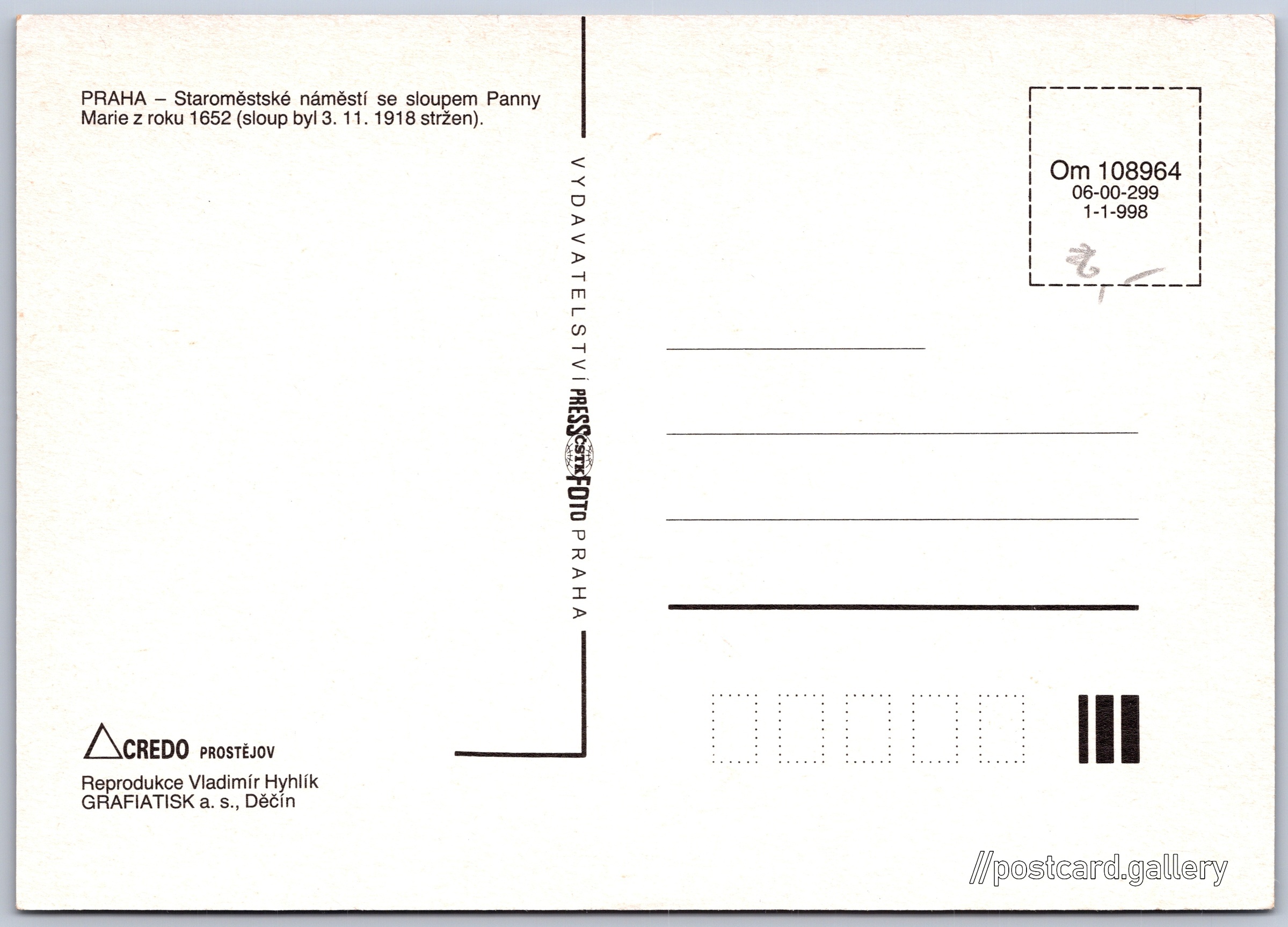 Praha, Staroměstské náměstí, kresba Pokud chcete vidět pohlednice ve vyšším rozlišení nebo zobrazovat jejich zadní stranu, tak se prosím nejdříve přihlašte Přihlásit Zaregistrovat PRAHA - Staroměstské náměstí se sloupem Panny Marie z roku 1652 (sloup byl 3. 11. 1918 stržen). Jazyk tištěného textu na pohlednici: čeština Staroměstské náměstí, Praha, Hlavní město Praha ukázat na mapě V blízkém okolí místa zobrazeného na pohlednici lze najít 159 jiných pohlednic. Zobrazit blízké pohlednice Vydavatel: PressFoto Praha (Československo) Rok vydání pohlednice: 1992 Velikost (š x v) a tvar pohlednice: 146 x 105 mm (5.75" x 4.13"), obdélník Osoby spjaté s touto pohlednicí: Vladimír Hyhlík(Design pohlednice) Čistá pohlednice (neprošlá poštou) Kódy na pohlednici: Om 108964 06-00-299 1-1-998 DiskuseVložit příspěvek Přidat novou složku ... Spravovat složky ...