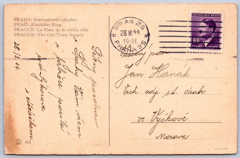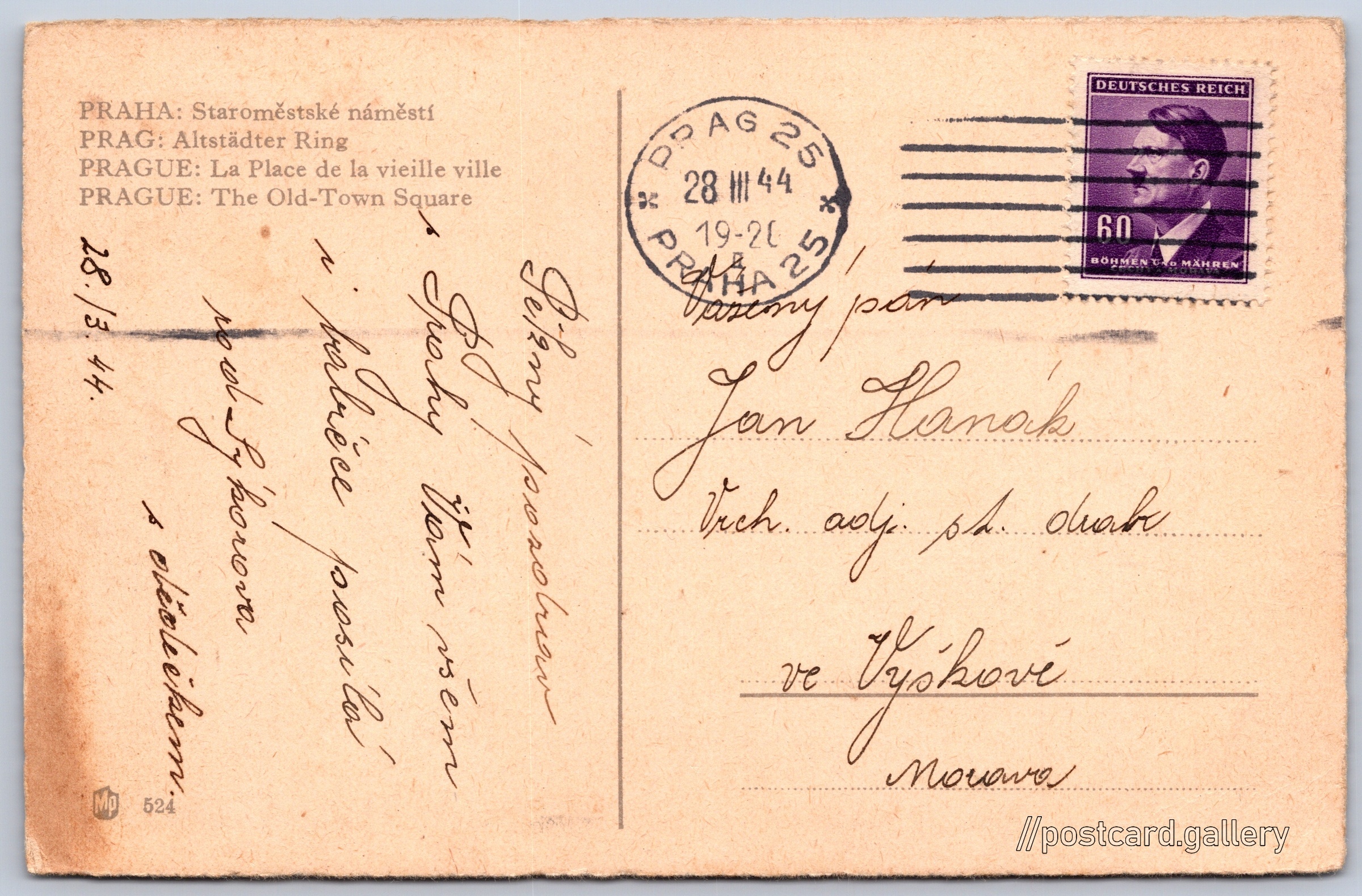 Praha, Staroměstské náměstí 2/159 Pokud chcete vidět pohlednice ve vyšším rozlišení nebo zobrazovat jejich zadní stranu, tak se prosím nejdříve přihlašte Přihlásit Zaregistrovat PRAHA: Staroměstské náměstíPRAG: Altstädter RingPRAGUE: La Place de la vieille villePRAGUE: The Old-Town Square Jazyky tištěného textu na pohlednici: čeština, němčina, francouzština, angličtina Staroměstské náměstí, Praha, Hlavní město Praha ukázat na mapě V blízkém okolí místa zobrazeného na pohlednici lze najít 159 jiných pohlednic. Zobrazit blízké pohlednice Odhadované datum vydání pohlednice: 1941 - 1944 Pomozte nám zpřesnit rok vzniku pohlednice Velikost (š x v) a tvar pohlednice: 139 x 90 mm (5.47" x 3.54"), obdélník Prošlá poštou:Datum na razítku: 28.3.1944Datum napsání pohledu: 28.3.1944 Ceny: Vyplacené známky: 0,60 Kčs (CSK) Kódy na pohlednici: 524 DiskuseVložit příspěvek Přidat novou složku ... Spravovat složky ...