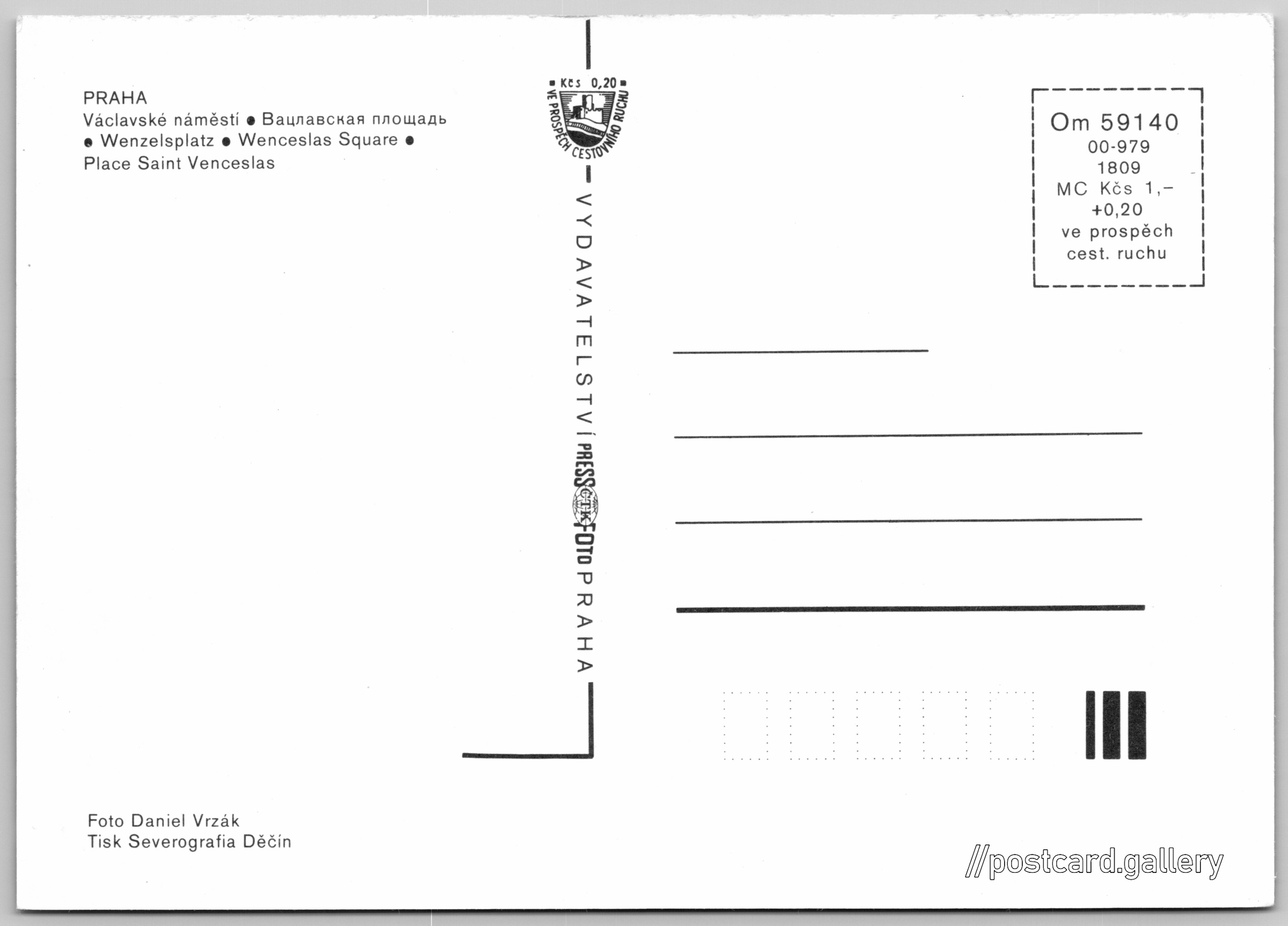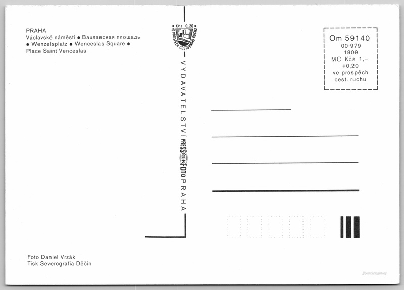 Praha, Václavské náměstí Pokud chcete vidět pohlednice ve vyšším rozlišení nebo zobrazovat jejich zadní stranu, tak se prosím nejdříve přihlašte Přihlásit Zaregistrovat PRAHA- Václavské náměstí- Вацлавская площадь- Wenzelsplatz- Wenceslas Square- Place Saint Venceslas Jazyky tištěného textu na pohlednici: čeština, ruština, němčina, angličtina, francouzština, francouzština Václavské náměstí 812/59, Praha, 110 00, Hlavní město Praha ukázat na mapě V blízkém okolí místa zobrazeného na pohlednici lze najít 159 jiných pohlednic. Zobrazit blízké pohlednice Vydavatel: PressFoto Praha (Československo) Rok vydání pohlednice: 1979 Velikost (š x v) a tvar pohlednice: 148 x 105 mm (5.83" x 4.13"), obdélník Osoby spjaté s touto pohlednicí: Daniel Vrzák(Autor fotografie) Čistá pohlednice (neprošlá poštou) Ceny: Cena pohlednice: 1,00 Kčs (CSK) (+0,20 Kčs přípl. na tur. ruch) Kódy na pohlednici: Om 59140 00-979 1809 DiskuseVložit příspěvek Přidat novou složku ... Spravovat složky ...