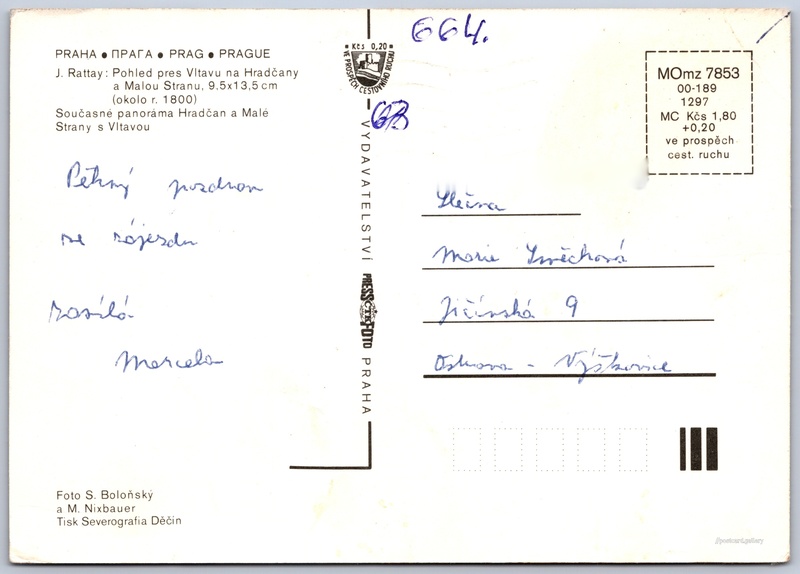 Praha Pokud chcete vidět pohlednice ve vyšším rozlišení nebo zobrazovat jejich zadní stranu, tak se prosím nejdříve přihlašte Přihlásit Zaregistrovat Praha PRAHA - ΠΡΑΓΑ - PRAG - PRAGUEJ. Rattay: Pohled přes Vltavu na Hradčany a Malou Stranu, 9,5x13,5 cm (okolo r. 1800)Současné panoráma Hradčan a Malé Strany s Vltavou Jazyky tištěného textu na pohlednici: čeština, ruština, němčina, angličtina Praha 1, Praha, Hlavní město Praha ukázat na mapě V blízkém okolí místa zobrazeného na pohlednici lze najít 159 jiných pohlednic. Zobrazit blízké pohlednice Vydavatel: Panorama (Československo) Rok vydání pohlednice: 1981 Velikost (š x v) a tvar pohlednice: 147 x 104 mm (5.79" x 4.09"), obdélník Osoby spjaté s touto pohlednicí: Miloš Nixbauer(Autor fotografie) Stanislav Boloňský(Autor fotografie) J. Rattay(Autor předlohy) Prošlá poštou Ceny: Cena pohlednice: 1,80 Kčs (CSK) (+0,20 Kčs přípl. na tur. ruch) Kódy na pohlednici: MOmz 7853 00-189 1297 DiskuseVložit příspěvek Přidat novou složku ... Spravovat složky ...