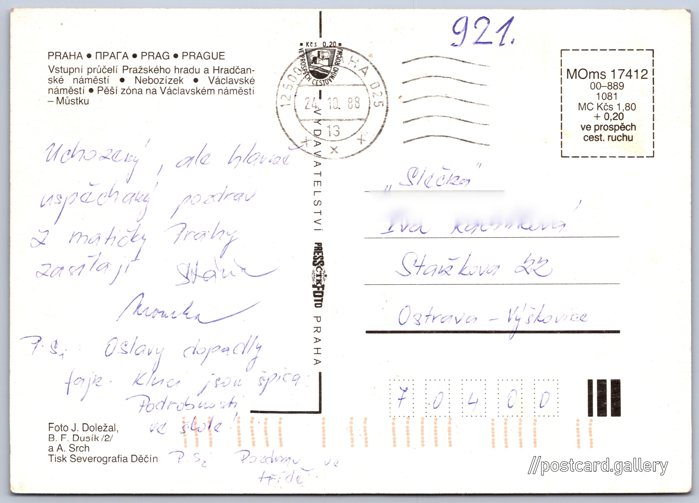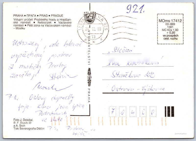 Praha Pokud chcete vidět pohlednice ve vyšším rozlišení nebo zobrazovat jejich zadní stranu, tak se prosím nejdříve přihlašte Přihlásit Zaregistrovat Praha PRAHA - ПРАГА - PRAG - PRAGUE- Vstupní průčelí Pražského hradu a Hradčanské náměstí- Nebozízek- Václavské náměstí- Pěší zóna na Václavském náměstí - Můstku Jazyky tištěného textu na pohlednici: čeština, ruština, němčina, angličtina Hradčanské náměstí, Praha, Hlavní město Praha ukázat na mapě Vydavatel: PressFoto Praha (Československo) Rok vydání pohlednice: 1988 Velikost (š x v) a tvar pohlednice: 139 x 104 mm (5.47" x 4.09"), obdélník Osoby spjaté s touto pohlednicí: B. F. Dusík(Autor fotografie) Antonín Srch(Autor fotografie) Jiří Doležal(Autor fotografie) Prošlá poštou:Datum na razítku: 24.10.1988 Ceny: Cena pohlednice: 1,80 Kčs (CSK) (+0,20 Kčs přípl. na tur. ruch) Kódy na pohlednici: MOms 17412 00-889 1081 DiskuseVložit příspěvek Přidat novou složku ... Spravovat složky ...