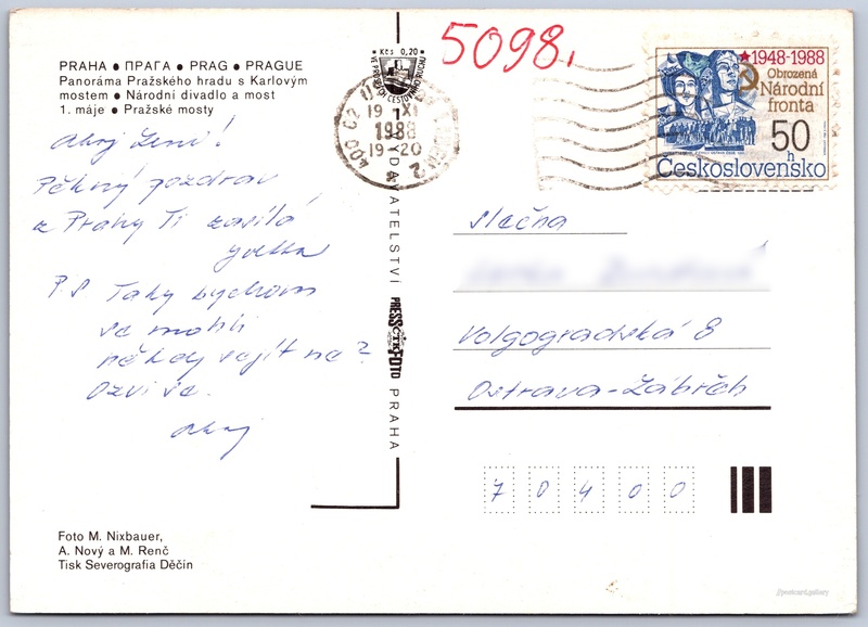Praha Pokud chcete vidět pohlednice ve vyšším rozlišení nebo zobrazovat jejich zadní stranu, tak se prosím nejdříve přihlašte Přihlásit Zaregistrovat Praha PRAHA - ΠΡΑΓΑ - PRAG - PRAGUE- Panoráma Pražského hradu s Karlovým mostem- Národní divadlo a most 1. máje- Pražské mosty Jazyky tištěného textu na pohlednici: čeština, ruština, němčina, angličtina Praha 1, Praha, Hlavní město Praha ukázat na mapě Vydavatel: PressFoto Praha (Československo) Odhadované datum vydání pohlednice: 1985 - 1988 Pomozte nám zpřesnit rok vzniku pohlednice Velikost (š x v) a tvar pohlednice: 147 x 105 mm (5.79" x 4.13"), obdélník Osoby spjaté s touto pohlednicí: Miloš Nixbauer(Autor fotografie) Miroslav Renč(Autor fotografie) Antonín E. Nový(Autor fotografie) Prošlá poštou:Datum na razítku: 19.11.1988 Ceny: Příplatek na tur. ruch: 0,20 Kčs (CSK))Vyplacené známky: 0,50 Kčs (CSK) DiskuseVložit příspěvek Přidat novou složku ... Spravovat složky ...