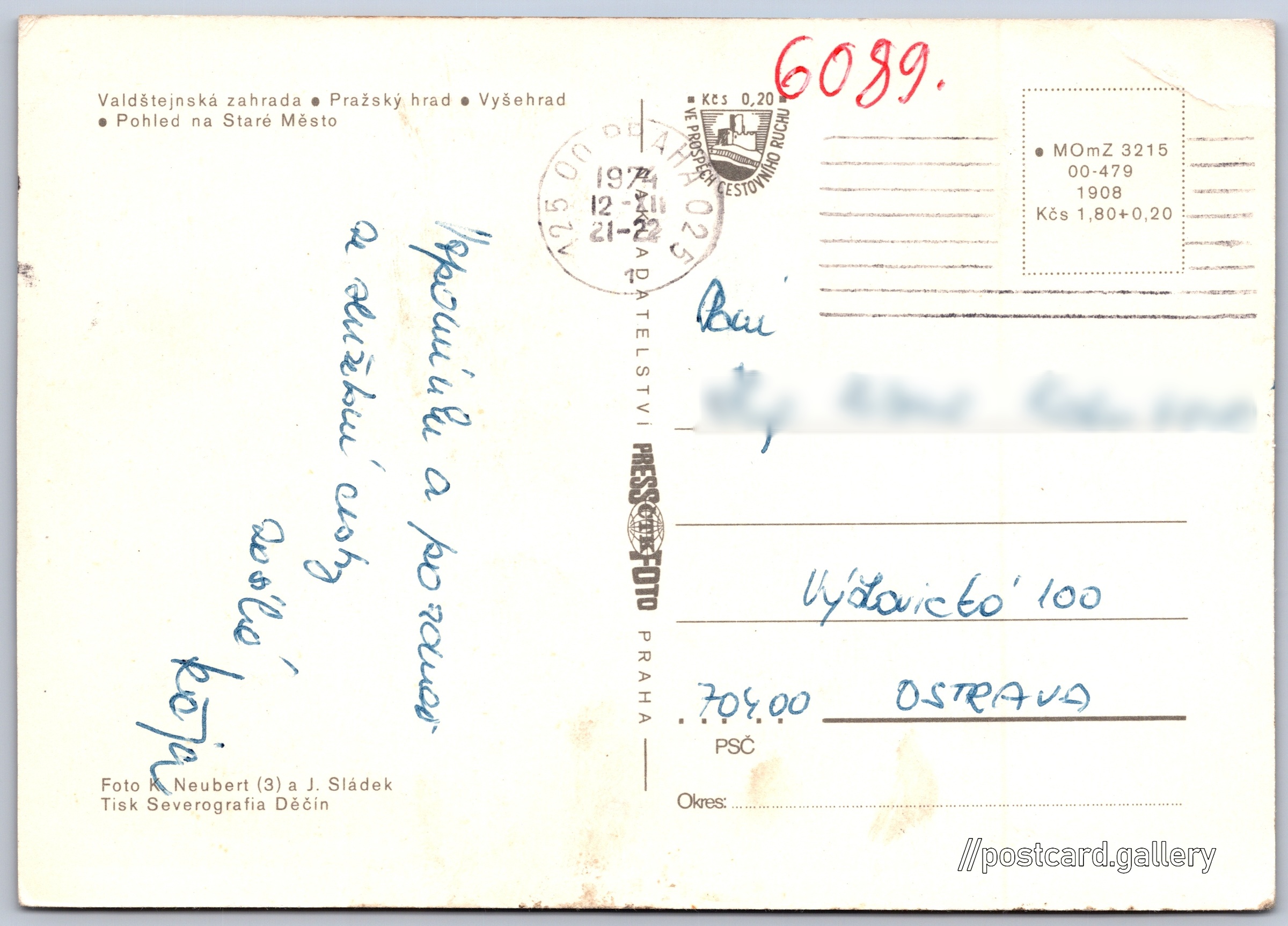 Praha Pokud chcete vidět pohlednice ve vyšším rozlišení nebo zobrazovat jejich zadní stranu, tak se prosím nejdříve přihlašte Přihlásit Zaregistrovat Praha - Valdštejnská zahrada- Pražský hrad.- Vyšehrad- Pohled na Staré Město Jazyk tištěného textu na pohlednici: čeština Praha 1, Praha, Hlavní město Praha ukázat na mapě Vydavatel: PressFoto Praha (Československo) Rok vydání pohlednice: 1974 Velikost (š x v) a tvar pohlednice: 148 x 105 mm (5.83" x 4.13"), obdélník Osoby spjaté s touto pohlednicí: Karel Neubert(Autor fotografie) J. Sládek(Autor fotografie) Prošlá poštou:Datum na razítku: 12.12.1974 Ceny: Cena pohlednice: 1,80 Kčs (CSK) (+0,20 Kčs přípl. na tur. ruch) Kódy na pohlednici: •MOmZ 3215 00-479 1908 DiskuseVložit příspěvek Přidat novou složku ... Spravovat složky ...