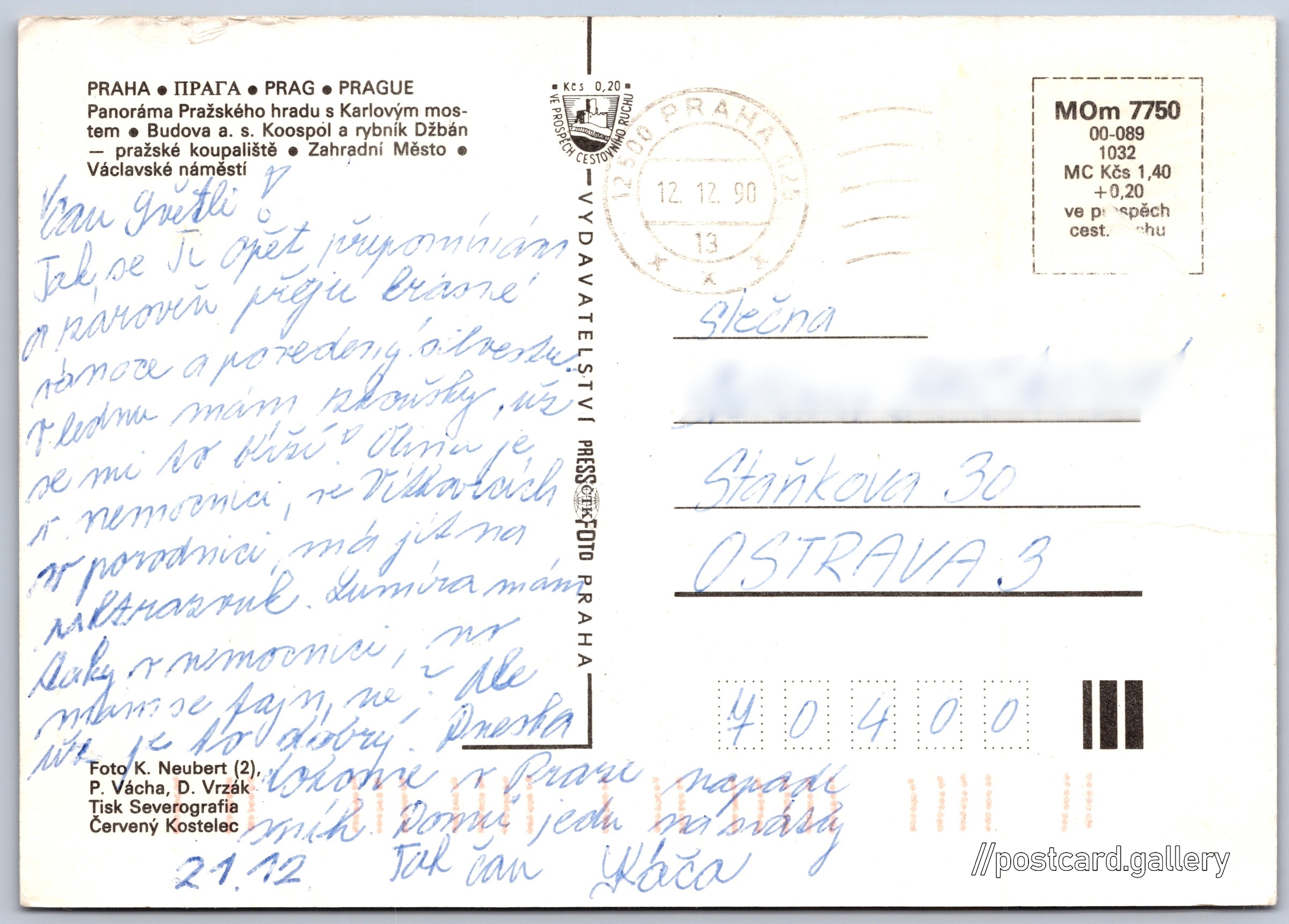 Praha Pokud chcete vidět pohlednice ve vyšším rozlišení nebo zobrazovat jejich zadní stranu, tak se prosím nejdříve přihlašte Přihlásit Zaregistrovat Praha PRAHA - ПРАГА - PRAG - PRAGUE- Panoráma Pražského hradu s Karlovým mostem- Budova a. s. Koospol a rybník Džbán - pražské koupaliště- Zahradní Město- Václavské náměstí Jazyky tištěného textu na pohlednici: čeština, ruština, němčina, angličtina Praha 1, Praha, Hlavní město Praha ukázat na mapě Vydavatel: PressFoto Praha (Československo) Rok vydání pohlednice: 1980 Velikost (š x v) a tvar pohlednice: 148 x 105 mm (5.83" x 4.13"), obdélník Osoby spjaté s touto pohlednicí: Daniel Vrzák(Autor fotografie) Karel Neubert(Autor fotografie) Pavel Vácha(Autor fotografie) Prošlá poštou:Datum na razítku: 12.12.1990 Ceny: Cena pohlednice: 1,40 Kčs (CSK) (+0,20 Kčs přípl. na tur. ruch) Kódy na pohlednici: MOm 7750 00-089 1032 DiskuseVložit příspěvek Přidat novou složku ... Spravovat složky ...