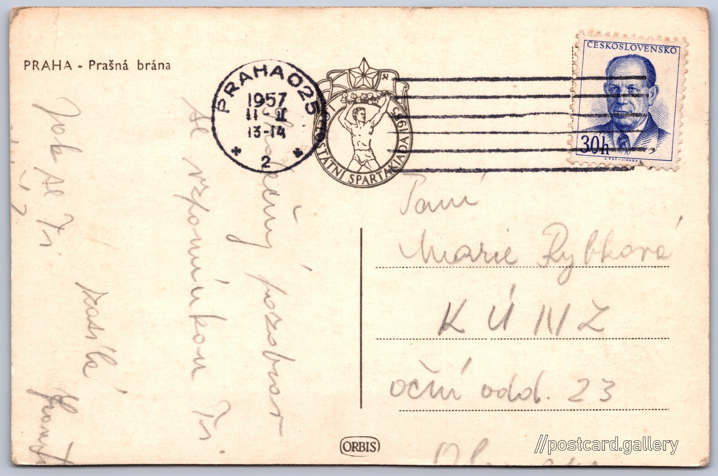 Praham, Prašná brána Pokud chcete vidět pohlednice ve vyšším rozlišení nebo zobrazovat jejich zadní stranu, tak se prosím nejdříve přihlašte Přihlásit Zaregistrovat PRAHA - Prašná brána Jazyk tištěného textu na pohlednici: čeština Prašná brána, Hradby, opevnění, U Prašné brány, Praha, Česko ukázat na mapě V blízkém okolí místa zobrazeného na pohlednici lze najít 159 jiných pohlednic. Zobrazit blízké pohlednice Vydavatel: Nakladatelství Orbis (Československo) Odhadované datum vydání pohlednice: 1954 - 1957 Pomozte nám zpřesnit rok vzniku pohlednice Velikost (š x v) a tvar pohlednice: 139 x 91 mm (5.47" x 3.58"), obdélník Prošlá poštou:Datum na razítku: 11.2.1957 Ceny: Vyplacené známky: 0,30 Kčs (CSK) DiskuseVložit příspěvek Přidat novou složku ... Spravovat složky ...