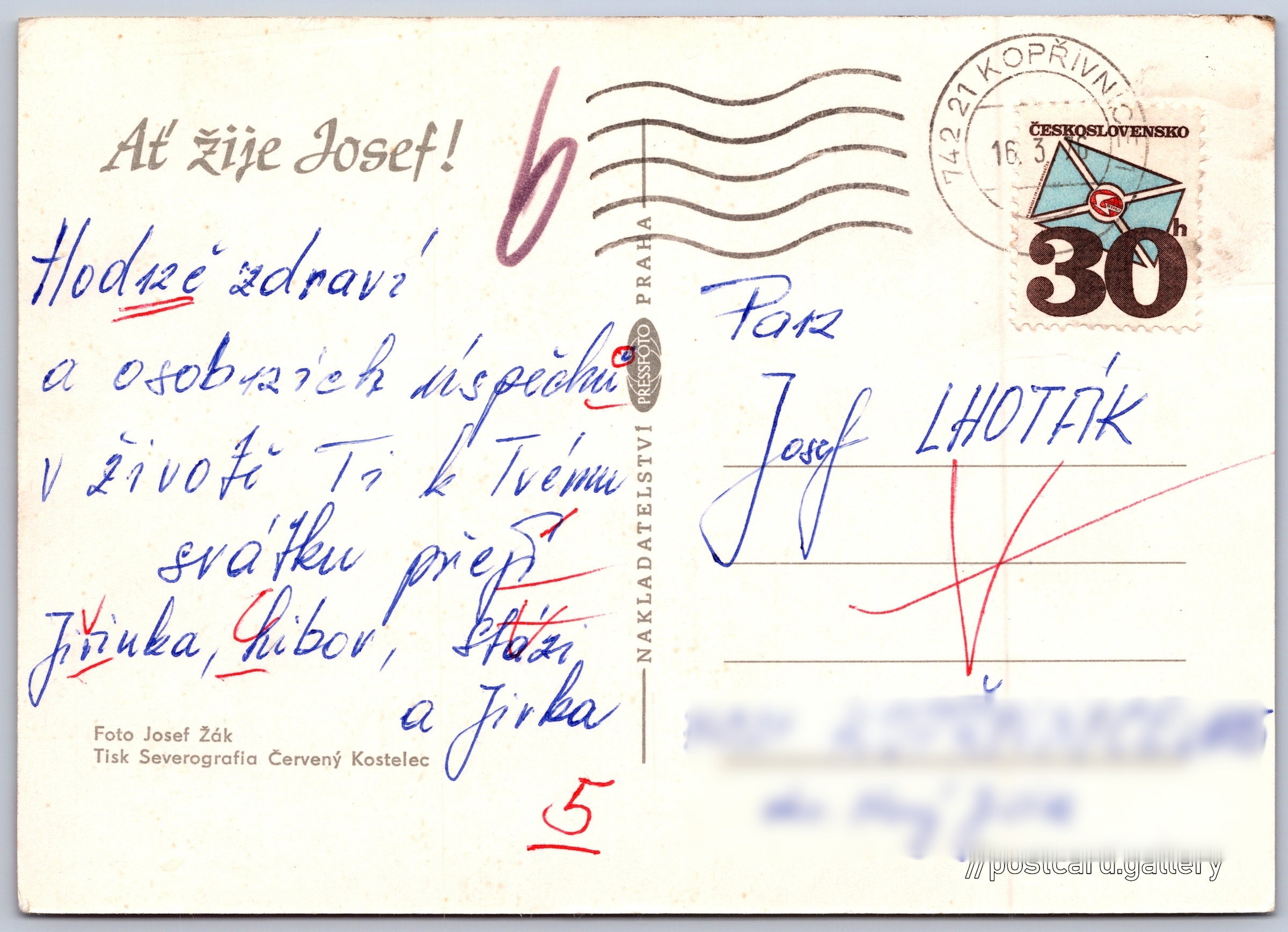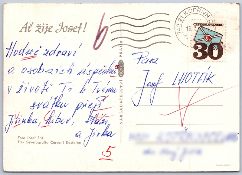 Přání, Josef, 19. březen Pokud chcete vidět pohlednice ve vyšším rozlišení nebo zobrazovat jejich zadní stranu, tak se prosím nejdříve přihlašte Přihlásit Zaregistrovat Březen 19 Ať žije Josef! Jazyk tištěného textu na pohlednici: čeština Vydavatel: PressFoto Praha (Československo) Odhadované datum vydání pohlednice: 1973 - 1976 Pomozte nám zpřesnit rok vzniku pohlednice Velikost (š x v) a tvar pohlednice: 147 x 105 mm (5.79" x 4.13"), obdélník Osoby spjaté s touto pohlednicí: Josef Žák(Autor fotografie) Prošlá poštou:Datum na razítku: 16.3.1976 Ceny: Vyplacené známky: 0,30 Kčs (CSK) DiskuseVložit příspěvek Přidat novou složku ... Spravovat složky ...