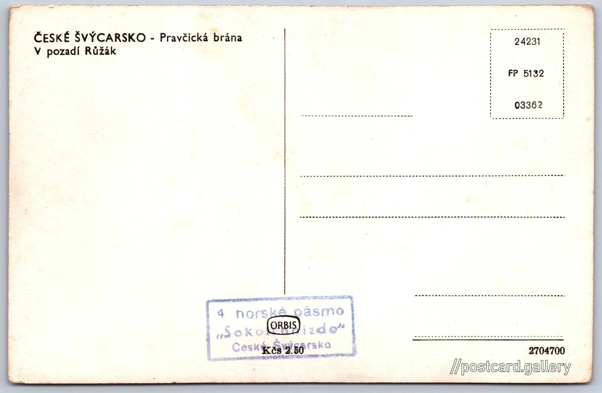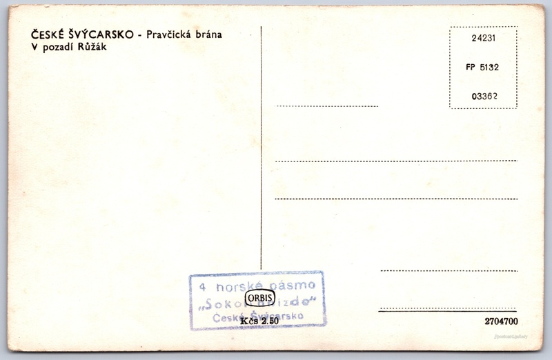 Pravčická brána, v pozadí Růžák Pokud chcete vidět pohlednice ve vyšším rozlišení nebo zobrazovat jejich zadní stranu, tak se prosím nejdříve přihlašte Přihlásit Zaregistrovat ČESKÉ ŠVÝCARSKO - Pravčická bránaV pozadí RůžákDole razítko:4 horské pásmo"Sokolí hnízdo"České Švýcarsko Jazyk tištěného textu na pohlednici: čeština Pravčická brána, Skalní útvar, Hřensko, Česko ukázat na mapě V blízkém okolí místa zobrazeného na pohlednici lze najít 30 jiných pohlednic. Zobrazit blízké pohlednice Vydavatel: Nakladatelství Orbis (Československo) Datum vydání není známo Pomozte nám odhadnout datum vzniku pohlednice Velikost (š x v) a tvar pohlednice: 138 x 90 mm (5.43" x 3.54"), obdélník Čistá pohlednice (neprošlá poštou) Ceny: Cena pohlednice: 2,50 Kčs (CSK) Kódy na pohlednici: 24231 FP 5132 03362 2704700 DiskuseVložit příspěvek Přidat novou složku ... Spravovat složky ...