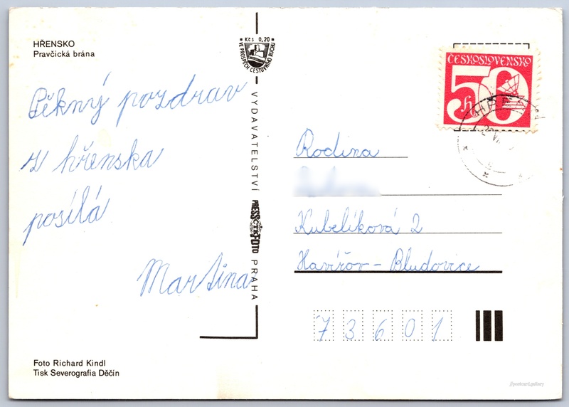 Pravčická brána Pokud chcete vidět pohlednice ve vyšším rozlišení nebo zobrazovat jejich zadní stranu, tak se prosím nejdříve přihlašte Přihlásit Zaregistrovat HŘENSKOPravčická brána Jazyk tištěného textu na pohlednici: čeština Pravčická brána, Skalní útvar, Hřensko, Česko ukázat na mapě V blízkém okolí místa zobrazeného na pohlednici lze najít 29 jiných pohlednic. Zobrazit blízké pohlednice Vydavatel: PressFoto Praha (Československo) Datum vydání není známo Pomozte nám odhadnout datum vzniku pohlednice Velikost (š x v) a tvar pohlednice: 147 x 103 mm (5.79" x 4.06"), obdélník Osoby spjaté s touto pohlednicí: Richard Kindl(Autor fotografie) Prošlá poštou Ceny: Příplatek na tur. ruch: 0,20 Kčs (CSK))Vyplacené známky: 0,50 Kčs (CSK) DiskuseVložit příspěvek Přidat novou složku ... Spravovat složky ...