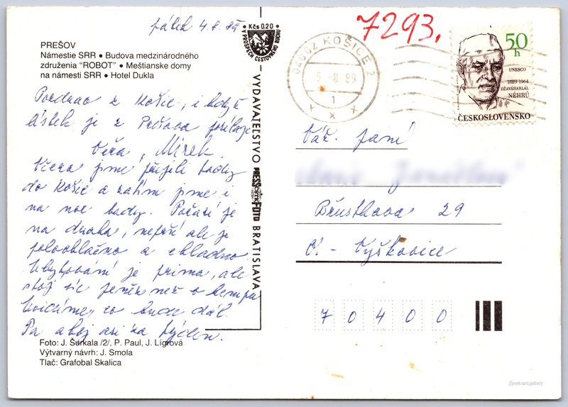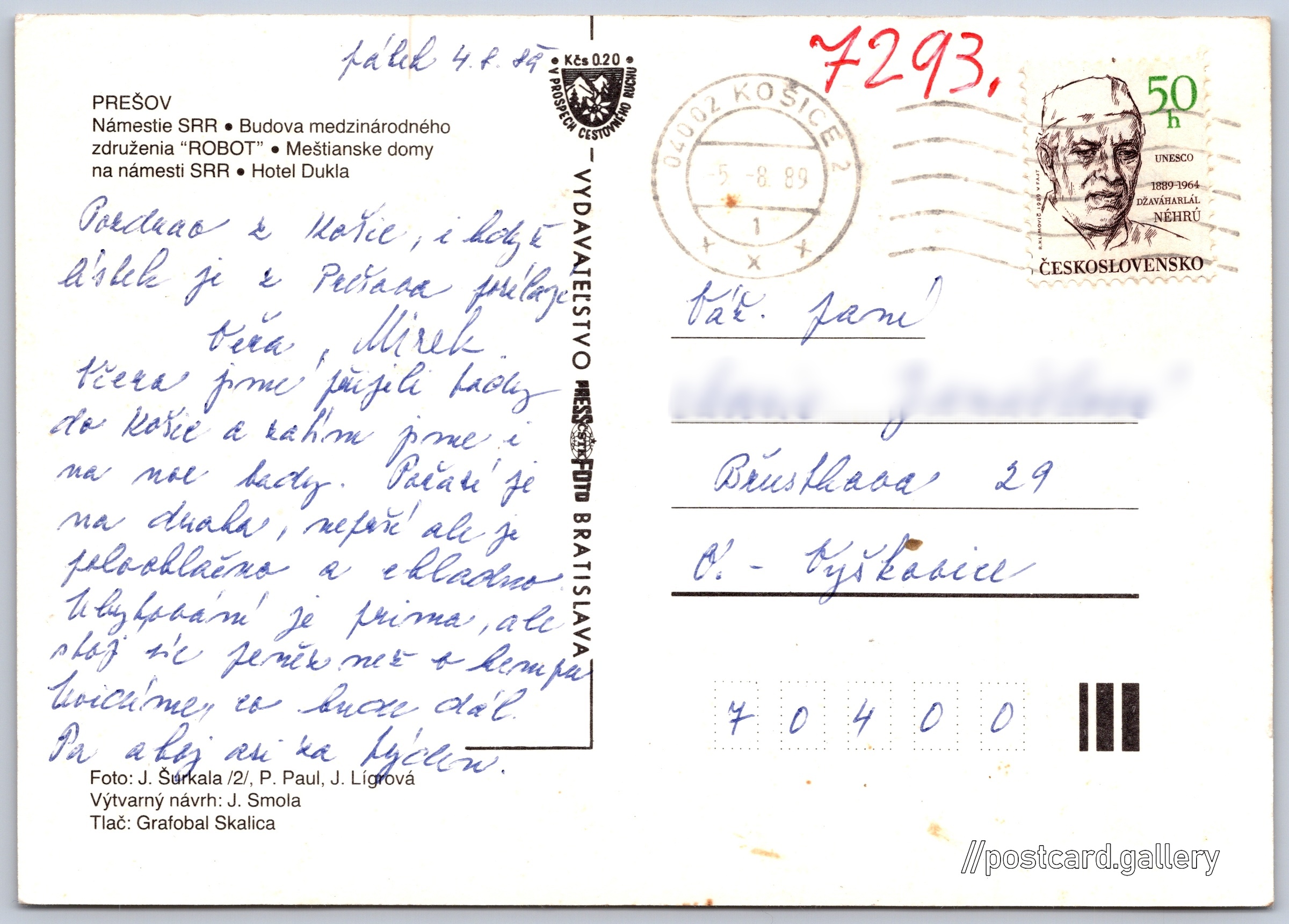 Prešov 5/6 Pokud chcete vidět pohlednice ve vyšším rozlišení nebo zobrazovat jejich zadní stranu, tak se prosím nejdříve přihlašte Přihlásit Zaregistrovat PREŠOV- Námestie SRR- Budova medzinárodného združenia "ROBOT"- Meštianske domy na námesti SRR- Hotel Dukla Jazyk tištěného textu na pohlednici: slovenština Prešov ukázat na mapě Vydavatel: PressFoto Bratislava (Československo) Odhadované datum vydání pohlednice: 1986 - 1989 Pomozte nám zpřesnit rok vzniku pohlednice Velikost (š x v) a tvar pohlednice: 148 x 105 mm (5.83" x 4.13"), obdélník Osoby spjaté s touto pohlednicí: Petr Paul(Autor fotografie) J. Šurkala(Autor fotografie) J. Smola(Design pohlednice) J. Lígrová(Autor fotografie) Prošlá poštou:Datum na razítku: 5.8.1989Datum napsání pohledu: 4.8.1989 Ceny: Vyplacené známky: 0,50 Kčs (CSK) DiskuseVložit příspěvek Přidat novou složku ... Spravovat složky ...