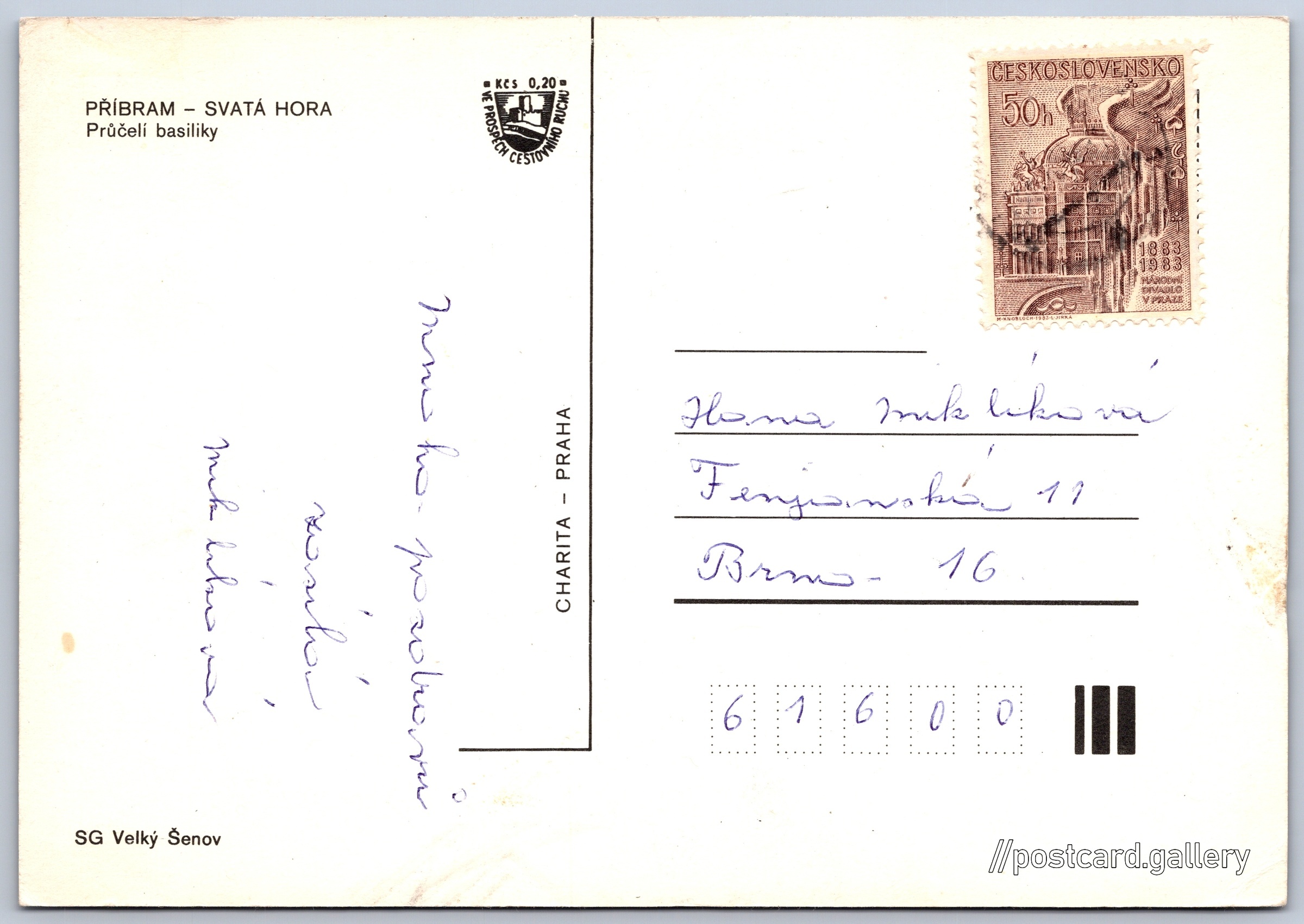 Příbram, Svatá Hora, průčelí baziliky 2/6 Pokud chcete vidět pohlednice ve vyšším rozlišení nebo zobrazovat jejich zadní stranu, tak se prosím nejdříve přihlašte Přihlásit Zaregistrovat PŘÍBRAM - SVATÁ HORAPrůčelí basiliky Jazyk tištěného textu na pohlednici: čeština Příbram II, Příbram, Příbram ukázat na mapě V blízkém okolí místa zobrazeného na pohlednici lze najít 6 jiných pohlednic. Zobrazit blízké pohlednice Vydavatel: Charita - Praha (Československo) Odhadované datum vydání pohlednice: 1980 - 1983 Pomozte nám zpřesnit rok vzniku pohlednice Velikost (š x v) a tvar pohlednice: 150 x 105 mm (5.91" x 4.13"), obdélník Prošlá poštou Ceny: Příplatek na tur. ruch: 0,20 Kčs (CSK))Vyplacené známky: 0,50 Kčs (CSK) DiskuseVložit příspěvek Přidat novou složku ... Spravovat složky ...