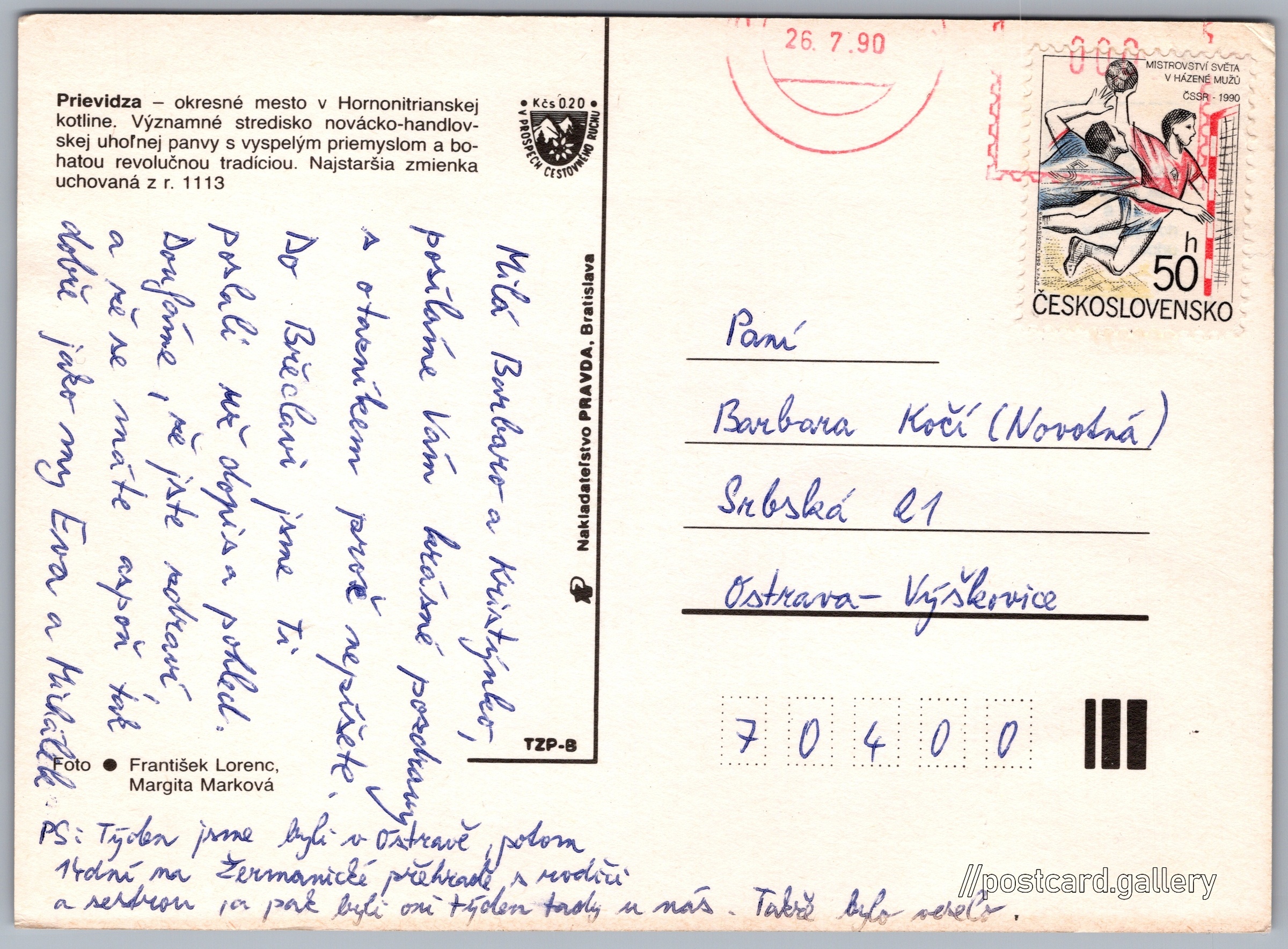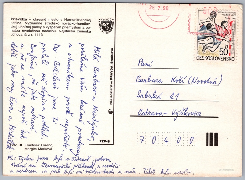 Prievidza Pokud chcete vidět pohlednice ve vyšším rozlišení nebo zobrazovat jejich zadní stranu, tak se prosím nejdříve přihlašte Přihlásit Zaregistrovat Prievidza Prievidzaokresné mesto v Hornonitrianskej kotline. Významné stredisko novácko-handlovskej uhoľnej panvy s vyspelým priemyslom a bohatou revolučnou tradíciou. Najstaršia zmienka uchovaná z r. 1113. Jazyk tištěného textu na pohlednici: slovenština Prievidza, Město, Slovensko ukázat na mapě V blízkém okolí místa zobrazeného na pohlednici lze najít 24 jiných pohlednic. Zobrazit blízké pohlednice Vydavatel: Nakladateľstvo PRAVDA, Bratislava (Československo) Odhadované datum vydání pohlednice: 1987 - 1990 Pomozte nám zpřesnit rok vzniku pohlednice Velikost (š x v) a tvar pohlednice: 147 x 107 mm (5.79" x 4.21"), obdélník Osoby spjaté s touto pohlednicí: Margita Marková(Autor fotografie) František Lorenc(Autor fotografie) Prošlá poštou:Datum na razítku: 26.7.1990 Ceny: Příplatek na tur. ruch: 0,20 Kčs (CSK))Vyplacené známky: 0,50 Kčs (CSK) DiskuseVložit příspěvek Přidat novou složku ... Spravovat složky ...