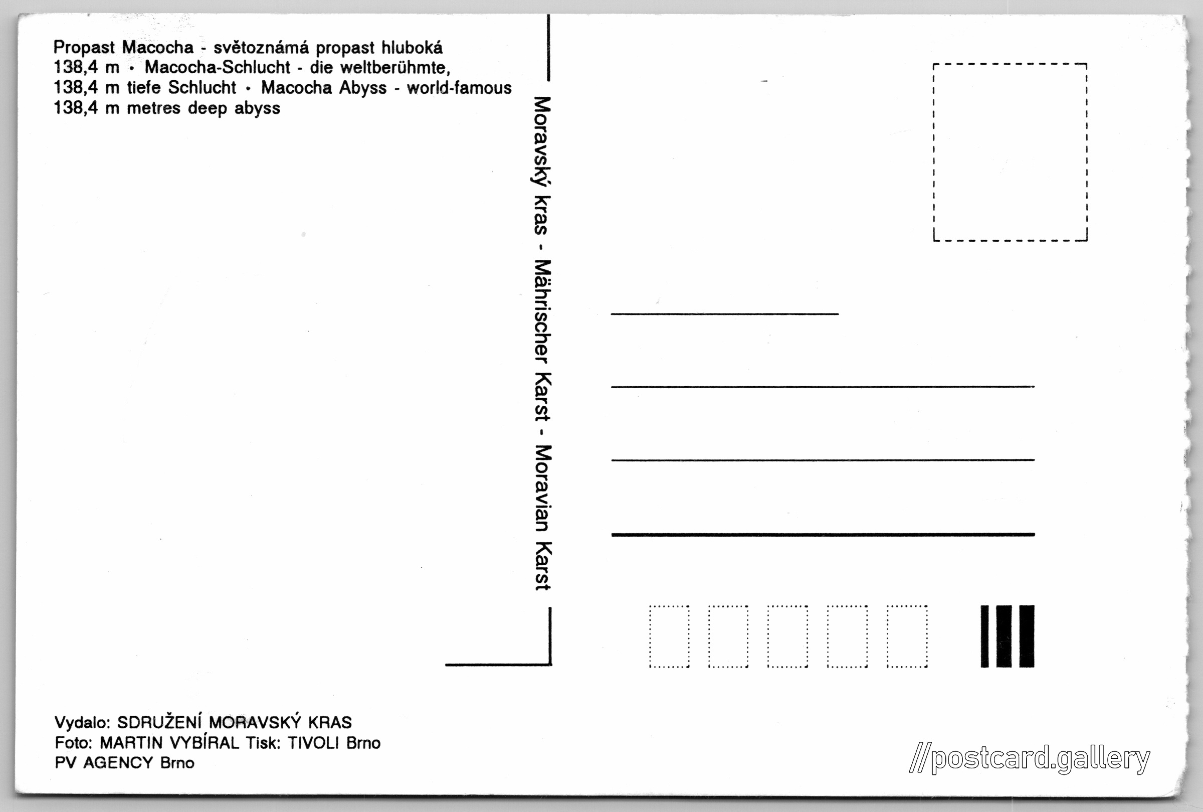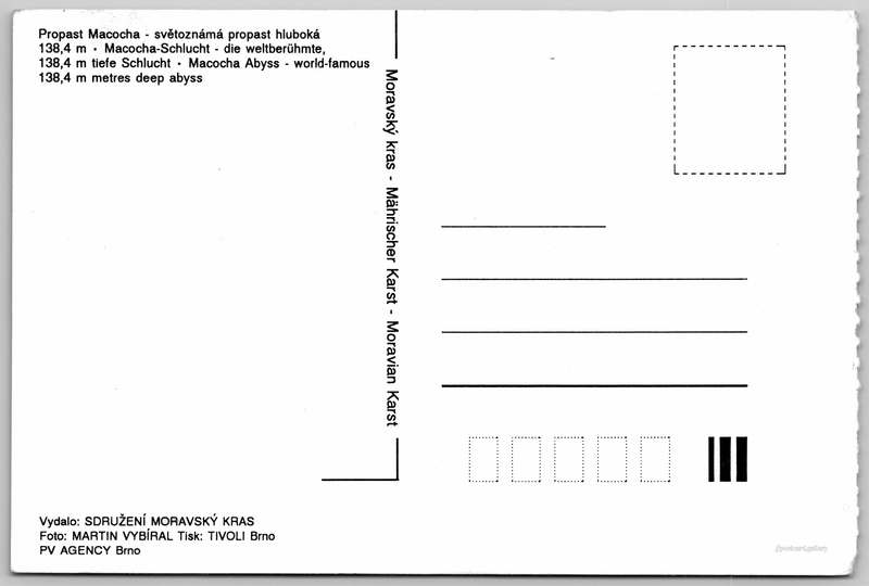 Propast Macocha 1/10 Pokud chcete vidět pohlednice ve vyšším rozlišení nebo zobrazovat jejich zadní stranu, tak se prosím nejdříve přihlašte Přihlásit Zaregistrovat Moravský kras - Mährischer Karst - Moravian KarstPropast Macocha - světoznámá propast hluboká 138,4 mMacocha-Schlucht - die weltberühmte, 138,4 m tiefe SchluchtMacocha Abyss - world-famous 138,4 m metres deep abyss Jazyk tištěného textu na pohlednici: čeština Vilémovice, Blansko ukázat na mapě V blízkém okolí místa zobrazeného na pohlednici lze najít 21 jiných pohlednic. Zobrazit blízké pohlednice Vydavatel: Sdružení Moravský Kras (Česko) Datum vydání není známo Pomozte nám odhadnout datum vzniku pohlednice Velikost (š x v) a tvar pohlednice: 152 x 101 mm (5.98" x 3.98"), obdélník Osoby spjaté s touto pohlednicí: Martin Vybíral(Autor fotografie) Čistá pohlednice (neprošlá poštou) DiskuseVložit příspěvek Přidat novou složku ... Spravovat složky ...