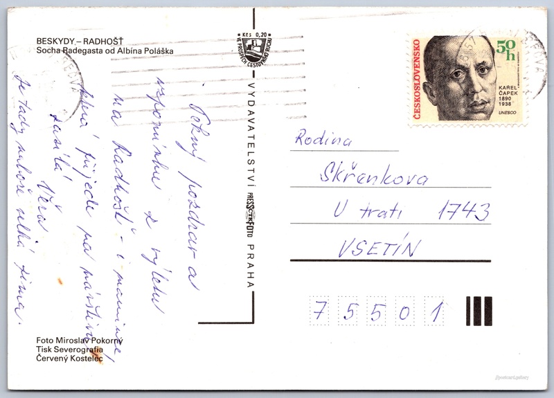 Pustevny, socha Radegasta Pokud chcete vidět pohlednice ve vyšším rozlišení nebo zobrazovat jejich zadní stranu, tak se prosím nejdříve přihlašte Přihlásit Zaregistrovat BESKYDY - RADHOŠŤSocha Radegasta od Albína Poláška Jazyk tištěného textu na pohlednici: čeština F7M3+25 Dolní Bečva, Czechia ukázat na mapě V blízkém okolí místa zobrazeného na pohlednici lze najít 32 jiných pohlednic. Zobrazit blízké pohlednice Vydavatel: PressFoto Praha (Československo) Datum vydání není známo Pomozte nám odhadnout datum vzniku pohlednice Velikost (š x v) a tvar pohlednice: 148 x 105 mm (5.83" x 4.13"), obdélník Osoby spjaté s touto pohlednicí: Miroslav Pokorný(Autor fotografie) Albín Polášek(Obsah pohlednice) Prošlá poštou Ceny: Příplatek na tur. ruch: 0,20 Kčs (CSK))Vyplacené známky: 0,50 Kčs (CSK) DiskuseVložit příspěvek Přidat novou složku ... Spravovat složky ...