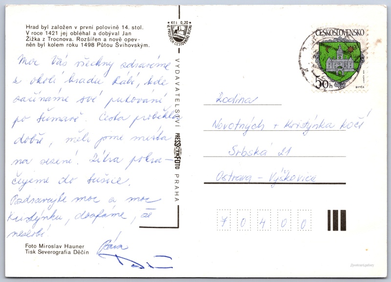 Rabí 4/6 Pokud chcete vidět pohlednice ve vyšším rozlišení nebo zobrazovat jejich zadní stranu, tak se prosím nejdříve přihlašte Přihlásit Zaregistrovat Rabí Hrad byl založen v první polovině 14. stol.V roce 1421 jej obléhal a dobýval Jan Žižka z Trocnova. Rozšířen a nově opevněn byl kolem roku 1498 Půtou Švihovským. Jazyk tištěného textu na pohlednici: čeština Zřícenina hradu Rabí, Zřícenina, Rabí, Česko ukázat na mapě V blízkém okolí místa zobrazeného na pohlednici lze najít 6 jiných pohlednic. Zobrazit blízké pohlednice Vydavatel: PressFoto Praha (Československo) Datum vydání není známo Pomozte nám odhadnout datum vzniku pohlednice Velikost (š x v) a tvar pohlednice: 148 x 106 mm (5.83" x 4.17"), obdélník Osoby spjaté s touto pohlednicí: Jan Žižka z Trocnova(Obsah pohlednice) Miroslav Hauner(Autor fotografie) Půta Švihovský z Rýzmberka(Obsah pohlednice) Prošlá poštou Ceny: Příplatek na tur. ruch: 0,20 Kčs (CSK))Vyplacené známky: 0,50 Kčs (CSK) DiskuseVložit příspěvek Přidat novou složku ... Spravovat složky ...