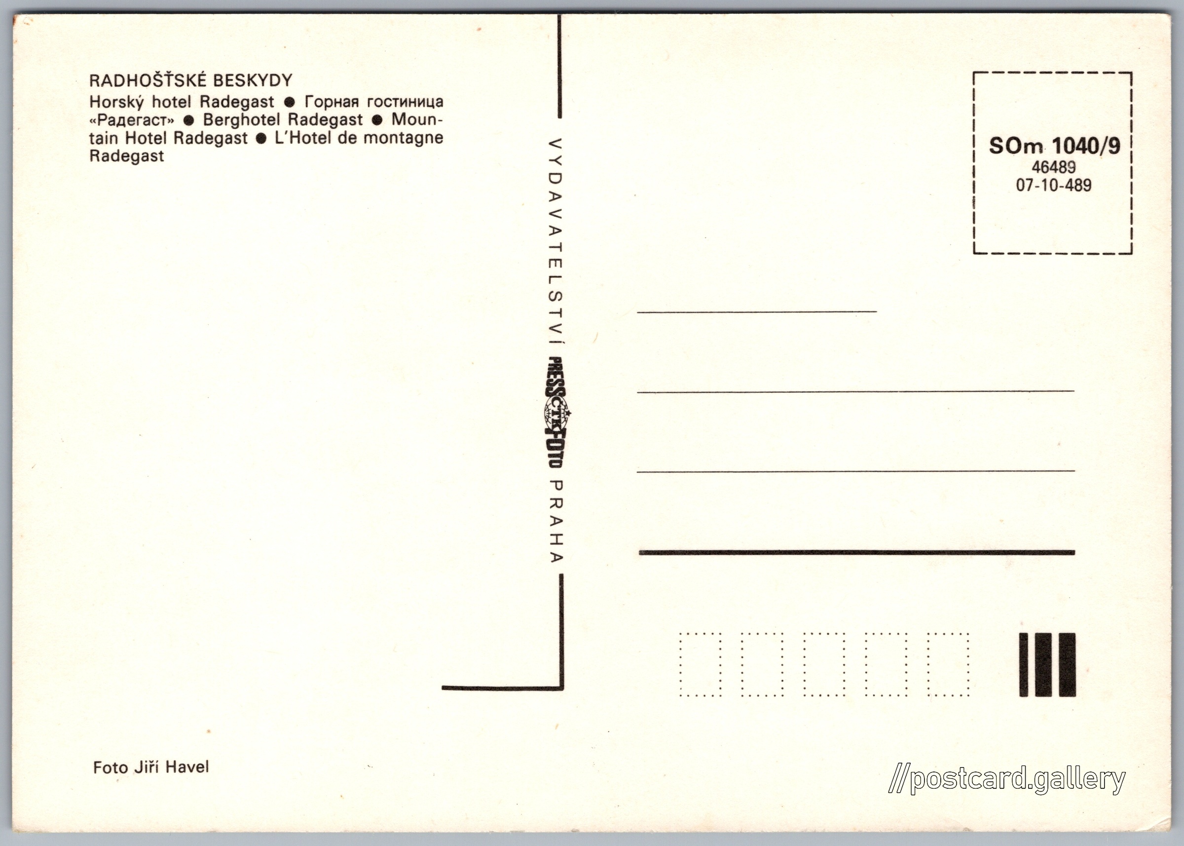 Radhošťské Beskydy Pokud chcete vidět pohlednice ve vyšším rozlišení nebo zobrazovat jejich zadní stranu, tak se prosím nejdříve přihlašte Přihlásit Zaregistrovat RADHOŠŤSKÉ BESKYDY- Horsky hotel Radegast - Горная гостиница Радегаст - Berghotel Radegast - Mountain Hotel Radegast - L'Hotel de montagne Radegast Jazyk tištěného textu na pohlednici: čeština Horský hotel Radegast, Dolní Bečva 287, Dolní Bečva, Česko ukázat na mapě V blízkém okolí místa zobrazeného na pohlednici lze najít 31 jiných pohlednic. Zobrazit blízké pohlednice Vydavatel: PressFoto Praha (Československo) Rok vydání pohlednice: 1984 Velikost (š x v) a tvar pohlednice: 147 x 104 mm (5.79" x 4.09"), obdélník Osoby spjaté s touto pohlednicí: Ing. Jiří Havel(Autor fotografie) Čistá pohlednice (neprošlá poštou) Kódy na pohlednici: SOm 1040/9 46489 07-10-489 DiskuseVložit příspěvek Přidat novou složku ... Spravovat složky ...