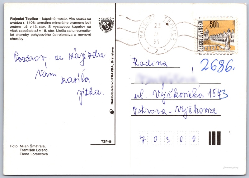 Rajecké Teplice Pokud chcete vidět pohlednice ve vyšším rozlišení nebo zobrazovat jejich zadní stranu, tak se prosím nejdříve přihlašte Přihlásit Zaregistrovat Rajecké Teplice Rajecké Teplice - kúpeľné mesto. Ako osada sa uvádza r. 1406; termálne minerálne pramene boli známe už v 13. stor. S výstavbou kúpeľov sa však započalo až v 18. stor. Liečia sa tu reumatické choroby pohybového ústrojenstva a nervové choroby Jazyk tištěného textu na pohlednici: slovenština Rajecké Teplice ukázat na mapě Vydavatel: Nakladateľstvo PRAVDA, Bratislava (Československo) Odhadované datum vydání pohlednice: 1982 - 1985 Pomozte nám zpřesnit rok vzniku pohlednice Velikost (š x v) a tvar pohlednice: 148 x 105 mm (5.83" x 4.13"), obdélník Osoby spjaté s touto pohlednicí: Elena Lorencová(Autor fotografie) František Lorenc(Autor fotografie) Milan Šmátrala(Autor fotografie) Prošlá poštou:Datum na razítku: 23.12.1985 Ceny: Příplatek na tur. ruch: 0,20 Kčs (CSK))Vyplacené známky: 0,50 Kčs (CSK) DiskuseVložit příspěvek Přidat novou složku ... Spravovat složky ...