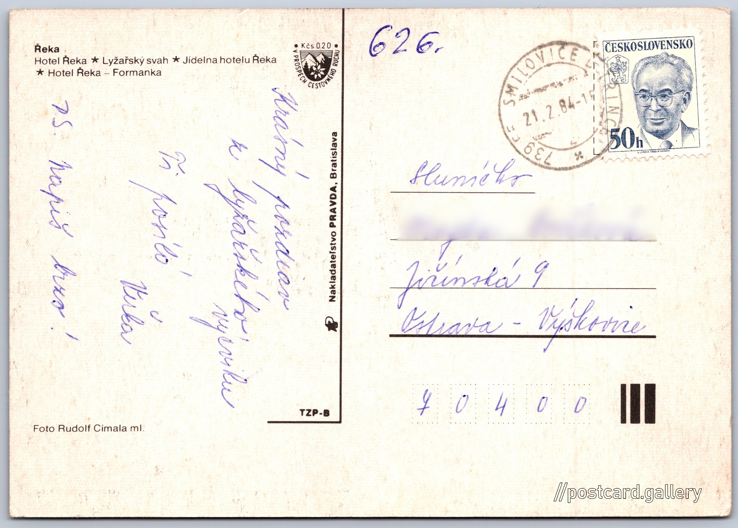 Řeka Pokud chcete vidět pohlednice ve vyšším rozlišení nebo zobrazovat jejich zadní stranu, tak se prosím nejdříve přihlašte Přihlásit Zaregistrovat Řeka Řeka- Hotel Řeka- Lyžařský svah- Jídelna hotelu Řeka- Hotel Řeka - Formanka Jazyk tištěného textu na pohlednici: čeština Řeka, Frýdek-Místek ukázat na mapě Vydavatel: Nakladateľstvo PRAVDA, Bratislava (Československo) Odhadované datum vydání pohlednice: 1981 - 1984 Pomozte nám zpřesnit rok vzniku pohlednice Velikost (š x v) a tvar pohlednice: 148 x 104 mm (5.83" x 4.09"), obdélník Osoby spjaté s touto pohlednicí: Rudolf Címala ml.(Autor fotografie) Prošlá poštou:Datum na razítku: 21.2.1984 Ceny: Příplatek na tur. ruch: 0,20 Kčs (CSK))Vyplacené známky: 0,50 Kčs (CSK) DiskuseVložit příspěvek Přidat novou složku ... Spravovat složky ...