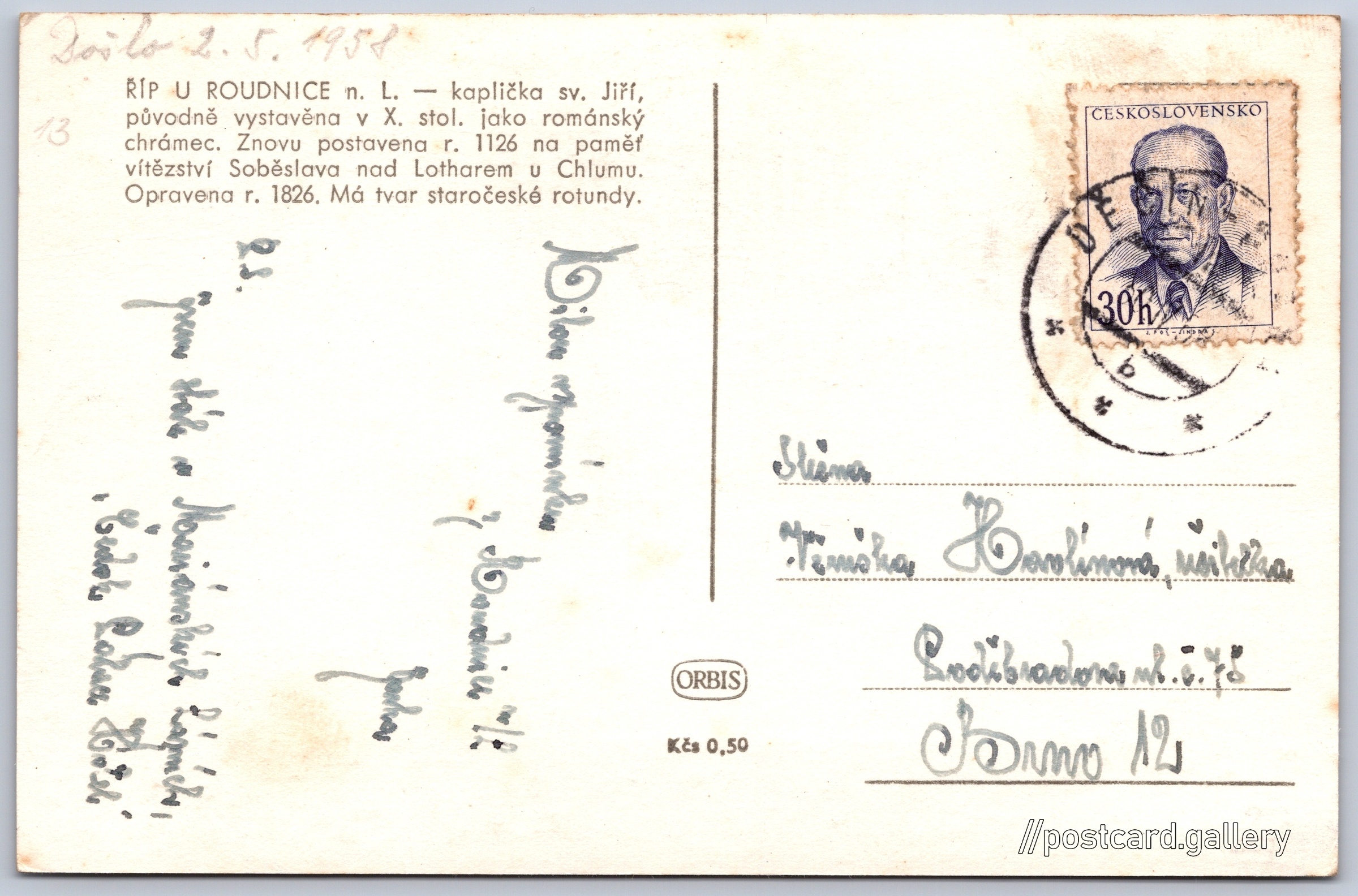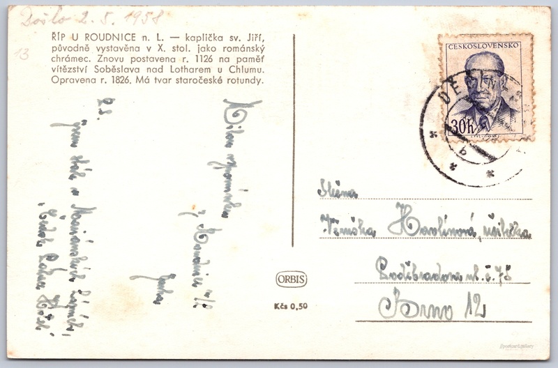 Říp, kaplička sv. Jiří Pokud chcete vidět pohlednice ve vyšším rozlišení nebo zobrazovat jejich zadní stranu, tak se prosím nejdříve přihlašte Přihlásit Zaregistrovat ŘÍP U ROUDNICE n. L. - kaplička sv. Jiří, původně vystavěna v X. stol. jako románský chrámec. Znovu postavena r. 1126 na paměť vítězství Soběslava nad Lotharem u Chlumu. Opravena r. 1826. Má tvar staročeské rotundy. Jazyk tištěného textu na pohlednici: čeština Mnetěš 125, 413 01 Mnetěš, Czechia ukázat na mapě V blízkém okolí místa zobrazeného na pohlednici lze najít 5 jiných pohlednic. Zobrazit blízké pohlednice Vydavatel: Nakladatelství Orbis (Československo) Datum vydání není známo Pomozte nám odhadnout datum vzniku pohlednice Velikost (š x v) a tvar pohlednice: 136 x 89 mm (5.35" x 3.50"), obdélník Osoby spjaté s touto pohlednicí: Soběslav I.(Obsah pohlednice) Lothar III.(Obsah pohlednice) Prošlá poštou Ceny: Cena pohlednice: 0,50 Kčs (CSK)Vyplacené známky: 0,30 Kčs (CSK) DiskuseVložit příspěvek Přidat novou složku ... Spravovat složky ...