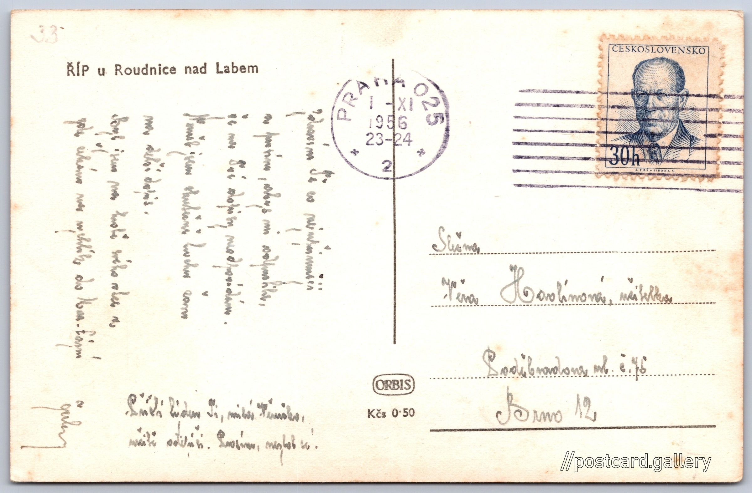 Říp u Roudnice nad Labem 2/15 Pokud chcete vidět pohlednice ve vyšším rozlišení nebo zobrazovat jejich zadní stranu, tak se prosím nejdříve přihlašte Přihlásit Zaregistrovat ŘÍP u Roudnice nad Labem Jazyk tištěného textu na pohlednici: čeština Říp (461 m), Hora, výškový bod, Mnetěš, Česko ukázat na mapě V blízkém okolí místa zobrazeného na pohlednici lze najít 5 jiných pohlednic. Zobrazit blízké pohlednice Vydavatel: Nakladatelství Orbis (Československo) Odhadované datum vydání pohlednice: 1953 - 1956 Pomozte nám zpřesnit rok vzniku pohlednice Velikost (š x v) a tvar pohlednice: 137 x 89 mm (5.39" x 3.50"), obdélník Prošlá poštou:Datum na razítku: 1.11.1956 Ceny: Cena pohlednice: 0,50 Kčs (CSK)Vyplacené známky: 0,30 Kčs (CSK) DiskuseVložit příspěvek Přidat novou složku ... Spravovat složky ...