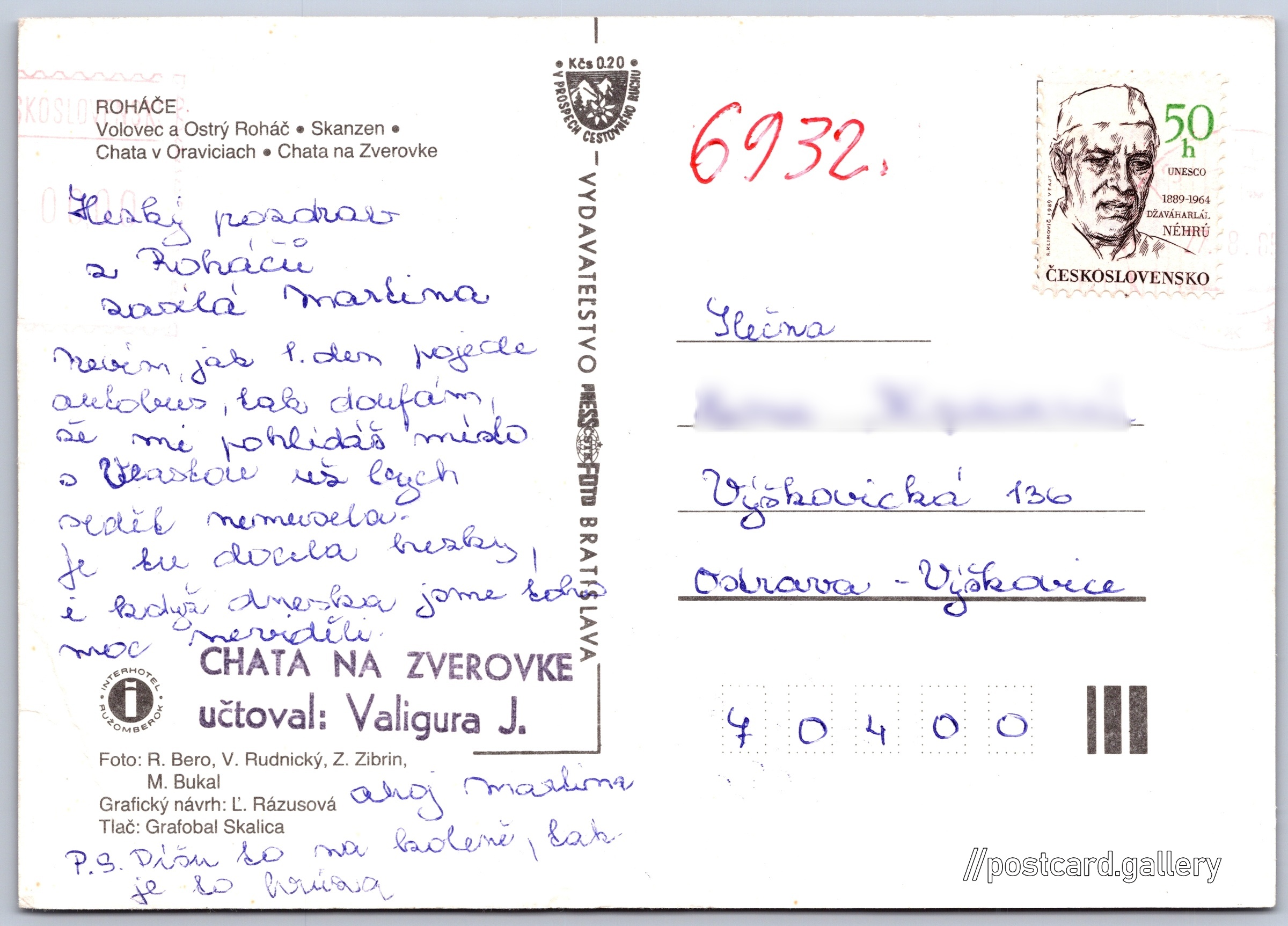 Roháče 9/13 Pokud chcete vidět pohlednice ve vyšším rozlišení nebo zobrazovat jejich zadní stranu, tak se prosím nejdříve přihlašte Přihlásit Zaregistrovat Roháče ROHÁČE- Volovec a Ostrý Roháč- Skanzen- Chata v Oraviciach- Chata na ZverovkeInterhotel Ružomberok Jazyk tištěného textu na pohlednici: slovenština Volovec (2063 m), Hora, výškový bod, Jamník, Žilinský kraj, Slovensko ukázat na mapě Vydavatel: PressFoto Bratislava (Československo) Datum vydání není známo Pomozte nám odhadnout datum vzniku pohlednice Velikost (š x v) a tvar pohlednice: 148 x 105 mm (5.83" x 4.13"), obdélník Osoby spjaté s touto pohlednicí: Z. Zibrin(Autor fotografie) Ľ. Rázusová(Design pohlednice) Viliam Rudnický(Autor fotografie) Ing. R. Bero(Autor fotografie) M. Bukal(Autor fotografie) Prošlá poštou Ceny: Příplatek na tur. ruch: 0,20 Kčs (CSK))Vyplacené známky: 0,50 Kčs (CSK) DiskuseVložit příspěvek Přidat novou složku ... Spravovat složky ...