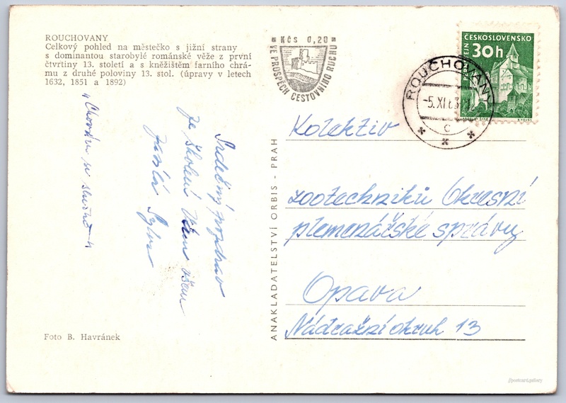 Rouchovany, celkový pohled Pokud chcete vidět pohlednice ve vyšším rozlišení nebo zobrazovat jejich zadní stranu, tak se prosím nejdříve přihlašte Přihlásit Zaregistrovat ROUCHOVANYCelkový pohled na městečko s jižní strany s dominantou starobylé románské věže z první čtvrtiny 13. století a s kněžištěm farního chrámu z druhé poloviny 13. stol. (úpravy v letech 1632, 1851 a 1892) Jazyk tištěného textu na pohlednici: čeština Rouchovany, Obec, Česko ukázat na mapě V blízkém okolí místa zobrazeného na pohlednici lze najít 4 jiné pohlednice. Zobrazit blízké pohlednice Vydavatel: Nakladatelství Orbis (Československo) Odhadované datum vydání pohlednice: 1960 - 1963 Pomozte nám zpřesnit rok vzniku pohlednice Velikost (š x v) a tvar pohlednice: 146 x 102 mm (5.75" x 4.02"), obdélník Osoby spjaté s touto pohlednicí: B. Havránek(Autor fotografie) Prošlá poštou:Datum na razítku: 5.11.1963 Ceny: Příplatek na tur. ruch: 0,20 Kčs (CSK))Vyplacené známky: 0,30 Kčs (CSK) DiskuseVložit příspěvek Přidat novou složku ... Spravovat složky ...