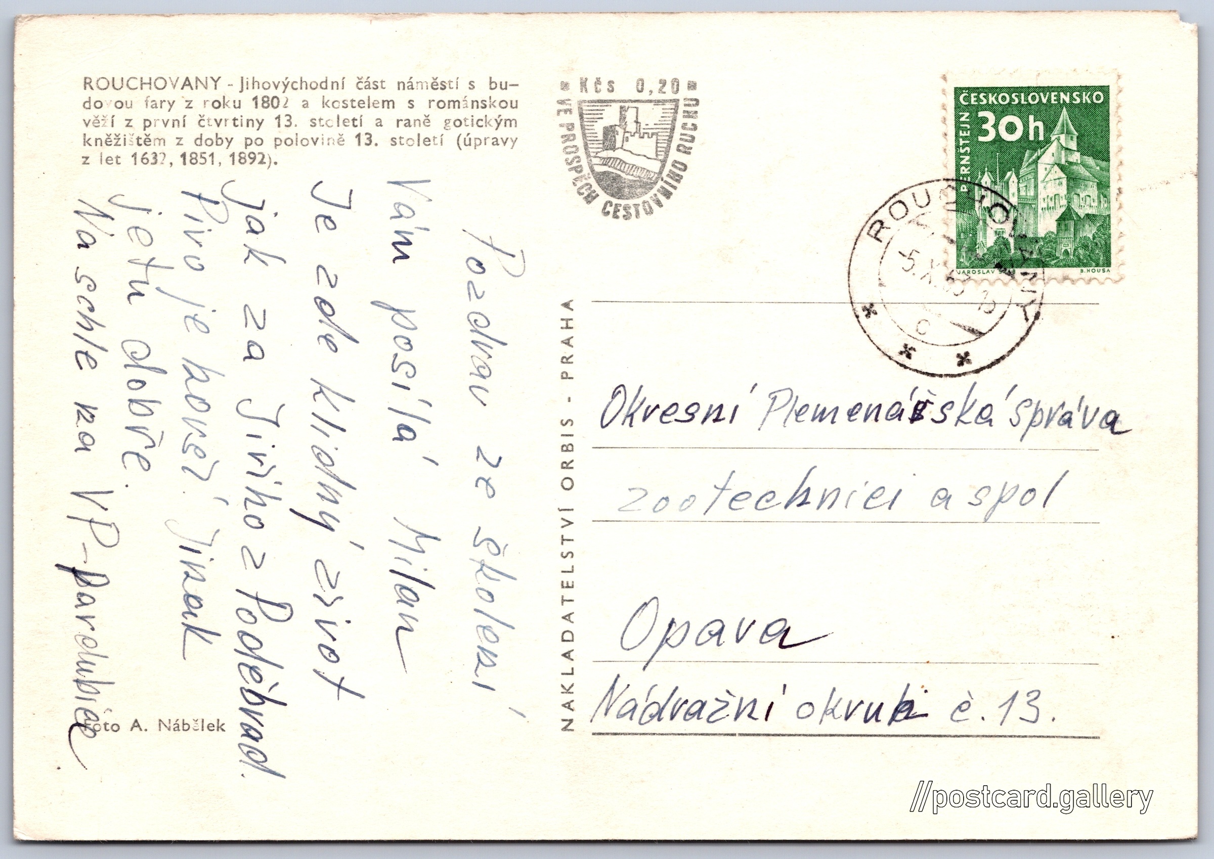 Rouchovany, náměstí Pokud chcete vidět pohlednice ve vyšším rozlišení nebo zobrazovat jejich zadní stranu, tak se prosím nejdříve přihlašte Přihlásit Zaregistrovat ROUCHOVANY - Jihovýchodní část náměstí s budovou fary z roku 1802 a kostelem s románskou věží z první čtvrtiny 13. století a raně gotickým kněžištěm z doby po polovině 13. století (úpravy z let 1632, 1851, 1892). Jazyk tištěného textu na pohlednici: čeština Rouchovany, Třebíč ukázat na mapě V blízkém okolí místa zobrazeného na pohlednici lze najít 4 jiné pohlednice. Zobrazit blízké pohlednice Vydavatel: Nakladatelství Orbis (Československo) Odhadované datum vydání pohlednice: 1960 - 1963 Pomozte nám zpřesnit rok vzniku pohlednice Velikost (š x v) a tvar pohlednice: 147 x 102 mm (5.79" x 4.02"), obdélník Osoby spjaté s touto pohlednicí: A. Nábělek(Autor fotografie) Prošlá poštou:Datum na razítku: 5.10.1963 Ceny: Příplatek na tur. ruch: 0,20 Kčs (CSK))Vyplacené známky: 0,30 Kčs (CSK) DiskuseVložit příspěvek Přidat novou složku ... Spravovat složky ...