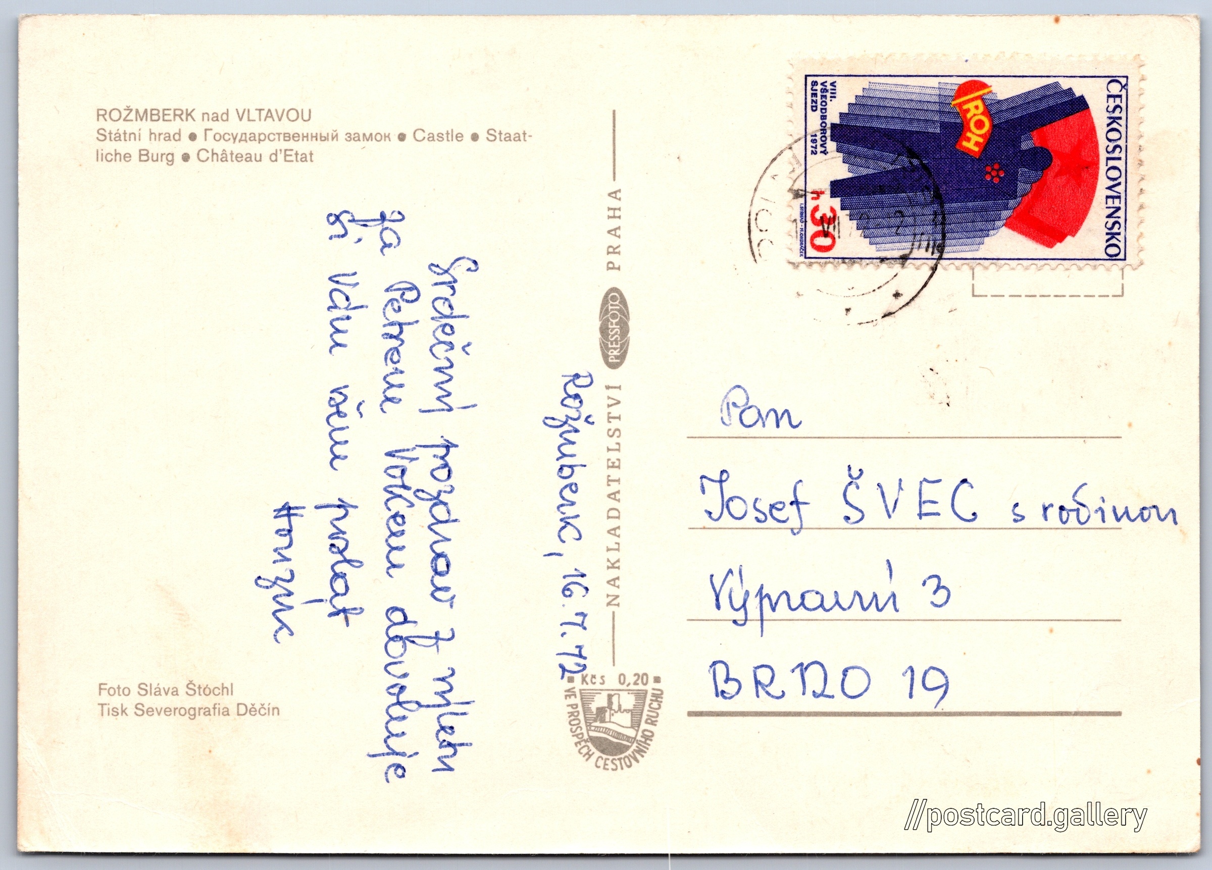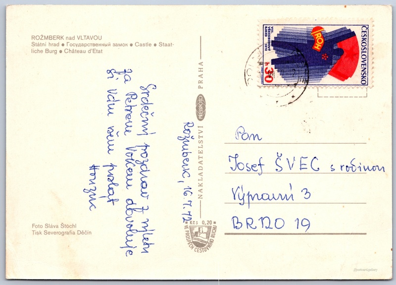 Rožmberk nad Vltavou Pokud chcete vidět pohlednice ve vyšším rozlišení nebo zobrazovat jejich zadní stranu, tak se prosím nejdříve přihlašte Přihlásit Zaregistrovat ROŽMBERK nad VLTAVOU- Státni hrad- Государственный замок- Castle- Staatliche Burg- Château d'Etat Jazyky tištěného textu na pohlednici: čeština, ruština, angličtina, němčina, francouzština, francouzština Hrad Rožmberk, Hrad, Rožmberk nad Vltavou, Česko ukázat na mapě V blízkém okolí místa zobrazeného na pohlednici lze najít 2 jiné pohlednice. Zobrazit blízké pohlednice Vydavatel: PressFoto Praha (Československo) Odhadované datum vydání pohlednice: 1969 - 1972 Pomozte nám zpřesnit rok vzniku pohlednice Velikost (š x v) a tvar pohlednice: 148 x 105 mm (5.83" x 4.13"), obdélník Osoby spjaté s touto pohlednicí: Sláva Štochl(Autor fotografie) Prošlá poštou:Datum na razítku: 17.7.1972Datum napsání pohledu: 16.7.1972 Ceny: Příplatek na tur. ruch: 0,20 Kčs (CSK))Vyplacené známky: 0,30 Kčs (CSK) DiskuseVložit příspěvek Přidat novou složku ... Spravovat složky ...