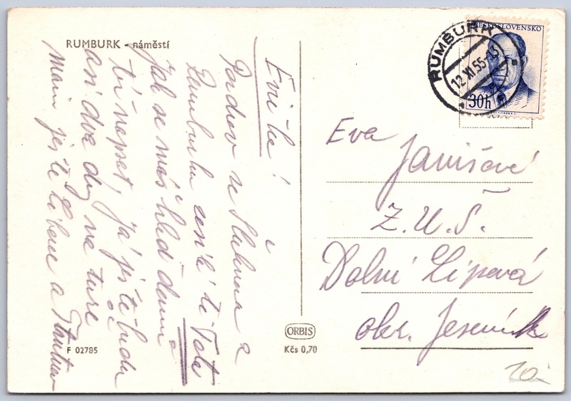 Rumburk, náměstí 2/3 Pokud chcete vidět pohlednice ve vyšším rozlišení nebo zobrazovat jejich zadní stranu, tak se prosím nejdříve přihlašte Přihlásit Zaregistrovat RUMBURK - náměstí Jazyk tištěného textu na pohlednici: angličtina Náměstí Lužické 388/3a, Rumburk, 408 01, Děčín ukázat na mapě V blízkém okolí místa zobrazeného na pohlednici lze najít 3 jiné pohlednice. Zobrazit blízké pohlednice Vydavatel: Nakladatelství Orbis (Československo) Odhadované datum vydání pohlednice: 1952 - 1955 Pomozte nám zpřesnit rok vzniku pohlednice Velikost (š x v) a tvar pohlednice: 146 x 101 mm (5.75" x 3.98"), obdélník Prošlá poštou:Datum na razítku: 12.11.1955 Ceny: Cena pohlednice: 0,70 Kčs (CSK)Vyplacené známky: 0,30 Kčs (CSK) Kódy na pohlednici: F 02785 DiskuseVložit příspěvek Přidat novou složku ... Spravovat složky ...