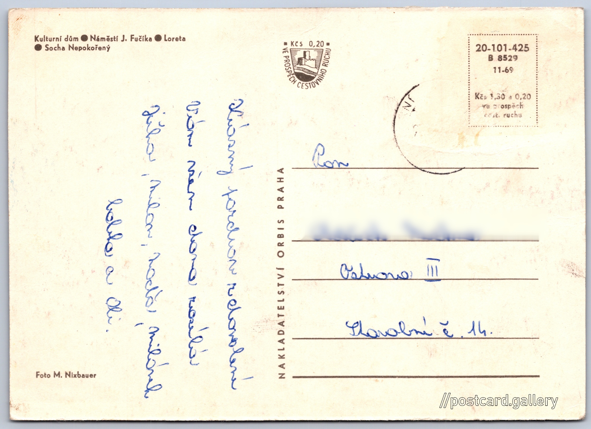 Rumburk Pokud chcete vidět pohlednice ve vyšším rozlišení nebo zobrazovat jejich zadní stranu, tak se prosím nejdříve přihlašte Přihlásit Zaregistrovat Rumburk - Kulturní dům- Náměstí J. Fučíka- Loreta- Socha Nepokořený Jazyk tištěného textu na pohlednici: čeština Loreta, Kaple, Třída 9. května 149/27, Rumburk 1, Česko ukázat na mapě V blízkém okolí místa zobrazeného na pohlednici lze najít 3 jiné pohlednice. Zobrazit blízké pohlednice Vydavatel: Nakladatelství Orbis (Československo) Rok vydání pohlednice: listopad, 1969 Velikost (š x v) a tvar pohlednice: 147 x 105 mm (5.79" x 4.13"), obdélník Osoby spjaté s touto pohlednicí: Julius Fučík(Jméno v názvu místa) Miloš Nixbauer(Autor fotografie) Prošlá poštou Ceny: Cena pohlednice: 1,30 Kčs (CSK) (+0,20 Kčs přípl. na tur. ruch) Kódy na pohlednici: 20-101-425 B 8529 11-69 DiskuseVložit příspěvek Přidat novou složku ... Spravovat složky ...