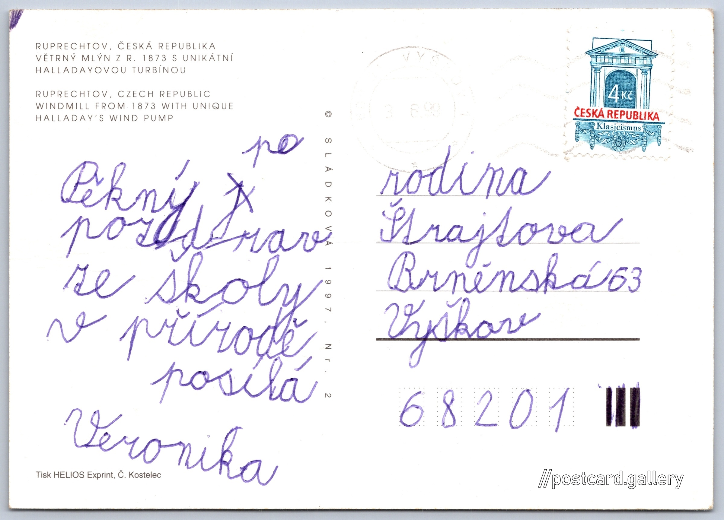 Ruprechtov, větrný mlýn 2/2 Pokud chcete vidět pohlednice ve vyšším rozlišení nebo zobrazovat jejich zadní stranu, tak se prosím nejdříve přihlašte Přihlásit Zaregistrovat - RUPRECHTOV, ČESKÁ REPUBLIKAVĚTRNÝ MLÝN Z R. 1873 S UNIKÁTNÍ HALLADAYOVOU TURBÍNOU- RUPRECHTOV, CZECH REPUBLICWINDMILL FROM 1873 WITH UNIQUE HALLADAY'S WIND PUMP Jazyky tištěného textu na pohlednici: čeština, angličtina Větrný mlýn Ruprechtov, Větrný mlýn, Ruprechtov 213, Ruprechtov, Česko ukázat na mapě V blízkém okolí místa zobrazeného na pohlednici lze najít 1 jinou pohlednici. Zobrazit blízké pohlednice Vydavatel: Sládková (Česko) Rok vydání pohlednice: 1997 Velikost (š x v) a tvar pohlednice: 146 x 104 mm (5.75" x 4.09"), obdélník Prošlá poštou:Datum na razítku: 3.6.1999 Ceny: Vyplacené známky: 4,00 Kč (CZK) Kódy na pohlednici: 2 DiskuseVložit příspěvek Přidat novou složku ... Spravovat složky ...