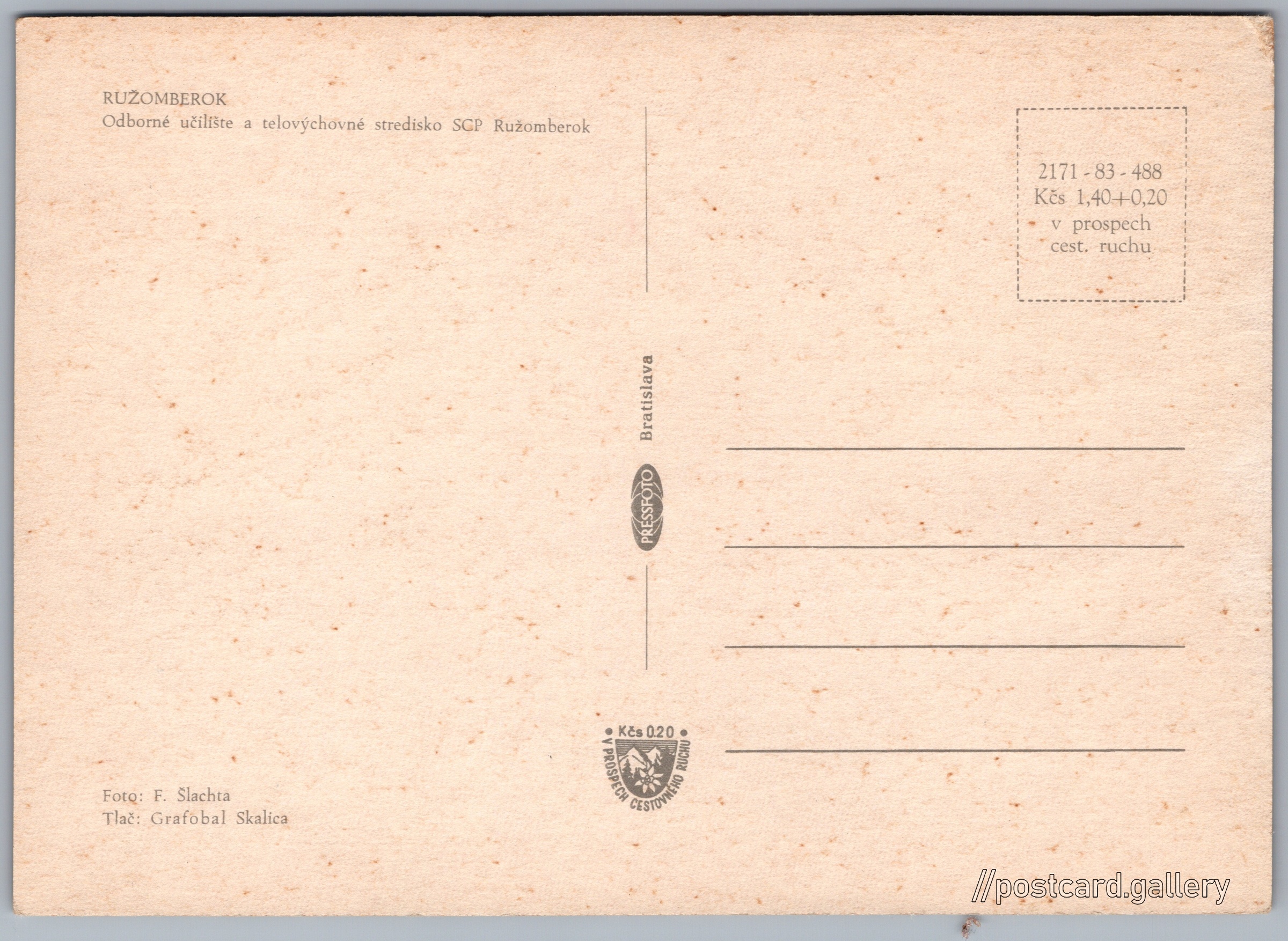 Ružomberok SCP 2/6 Pokud chcete vidět pohlednice ve vyšším rozlišení nebo zobrazovat jejich zadní stranu, tak se prosím nejdříve přihlašte Přihlásit Zaregistrovat Ružomberok SCP RUŽOMBEROKOdborné učilište a telovýchovné stredisko SCP Ružomberok Jazyk tištěného textu na pohlednici: slovenština Ružomberok, Město, Slovensko ukázat na mapě V blízkém okolí místa zobrazeného na pohlednici lze najít 9 jiných pohlednic. Zobrazit blízké pohlednice Vydavatel: PressFoto Bratislava (Československo) Datum vydání není známo Pomozte nám odhadnout datum vzniku pohlednice Velikost (š x v) a tvar pohlednice: 148 x 107 mm (5.83" x 4.21"), obdélník Osoby spjaté s touto pohlednicí: František Šlachta(Autor fotografie) Čistá pohlednice (neprošlá poštou) Ceny: Cena pohlednice: 1,40 Kčs (CSK) (+0,20 Kčs přípl. na tur. ruch) Kódy na pohlednici: 2171-83-488 DiskuseVložit příspěvek Přidat novou složku ... Spravovat složky ...