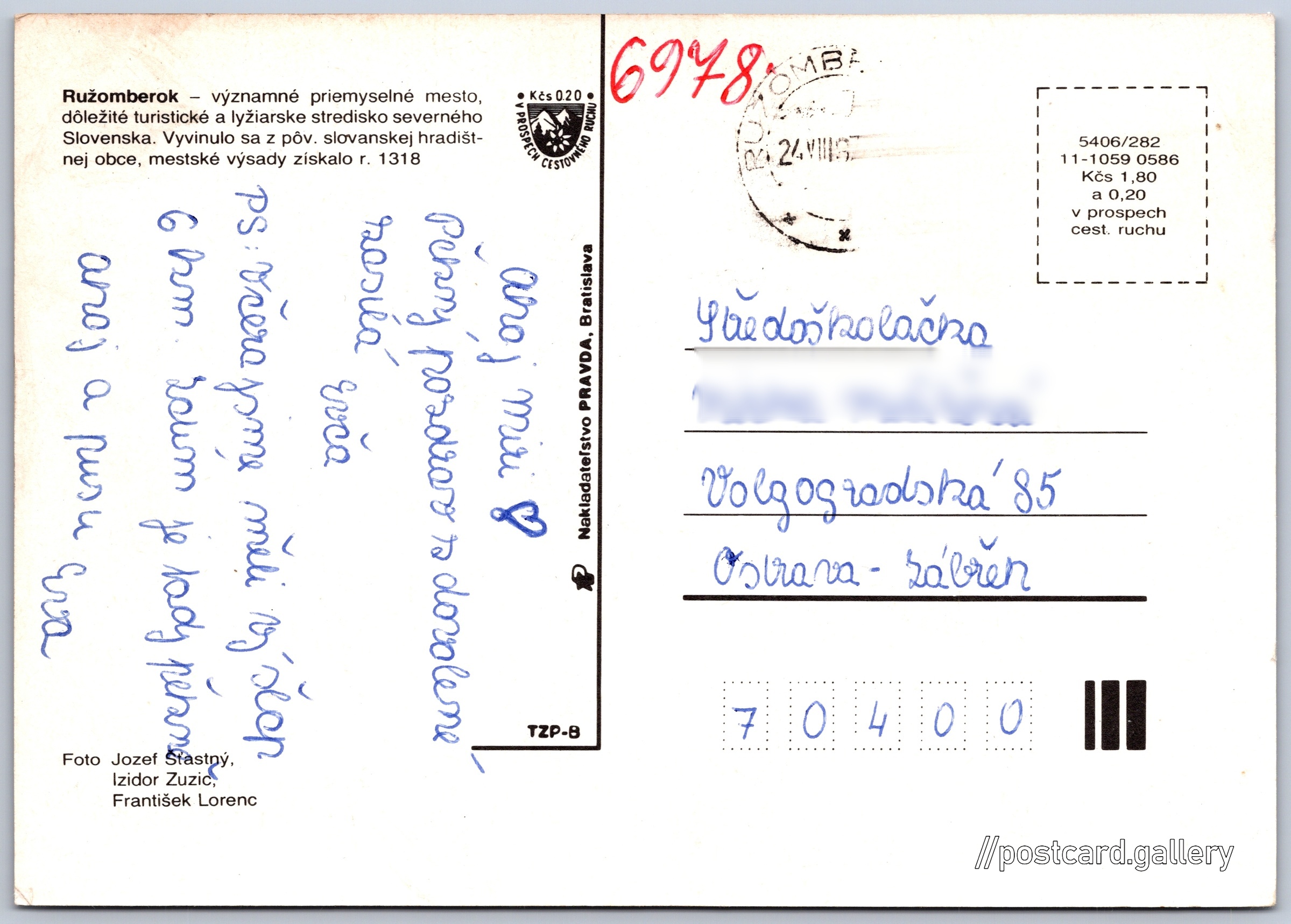 Ružomberok Pokud chcete vidět pohlednice ve vyšším rozlišení nebo zobrazovat jejich zadní stranu, tak se prosím nejdříve přihlašte Přihlásit Zaregistrovat Ružomberok Ružomberok - významné priemyselné mesto, dôležité turistické a lyžiarske stredisko severného Slovenska. Vyvinulo sa z pôv. slovanskej hradištnej obce, mestské výsady získalo r. 1318 Jazyk tištěného textu na pohlednici: slovenština Ružomberok, Město, Slovensko ukázat na mapě V blízkém okolí místa zobrazeného na pohlednici lze najít 10 jiných pohlednic. Zobrazit blízké pohlednice Vydavatel: Nakladateľstvo PRAVDA, Bratislava (Československo) Rok vydání pohlednice: květen, 1986 Velikost (š x v) a tvar pohlednice: 141 x 105 mm (5.55" x 4.13"), obdélník Osoby spjaté s touto pohlednicí: Jozef Šťastný(Autor fotografie) František Lorenc(Autor fotografie) Izidor Zuzic(Autor fotografie) Prošlá poštou:Datum na razítku: 24.8.1987 Ceny: Cena pohlednice: 1,80 Kčs (CSK) (+0,20 Kčs přípl. na tur. ruch) Kódy na pohlednici: 5406/282 11-1059 0586 DiskuseVložit příspěvek Přidat novou složku ... Spravovat složky ...