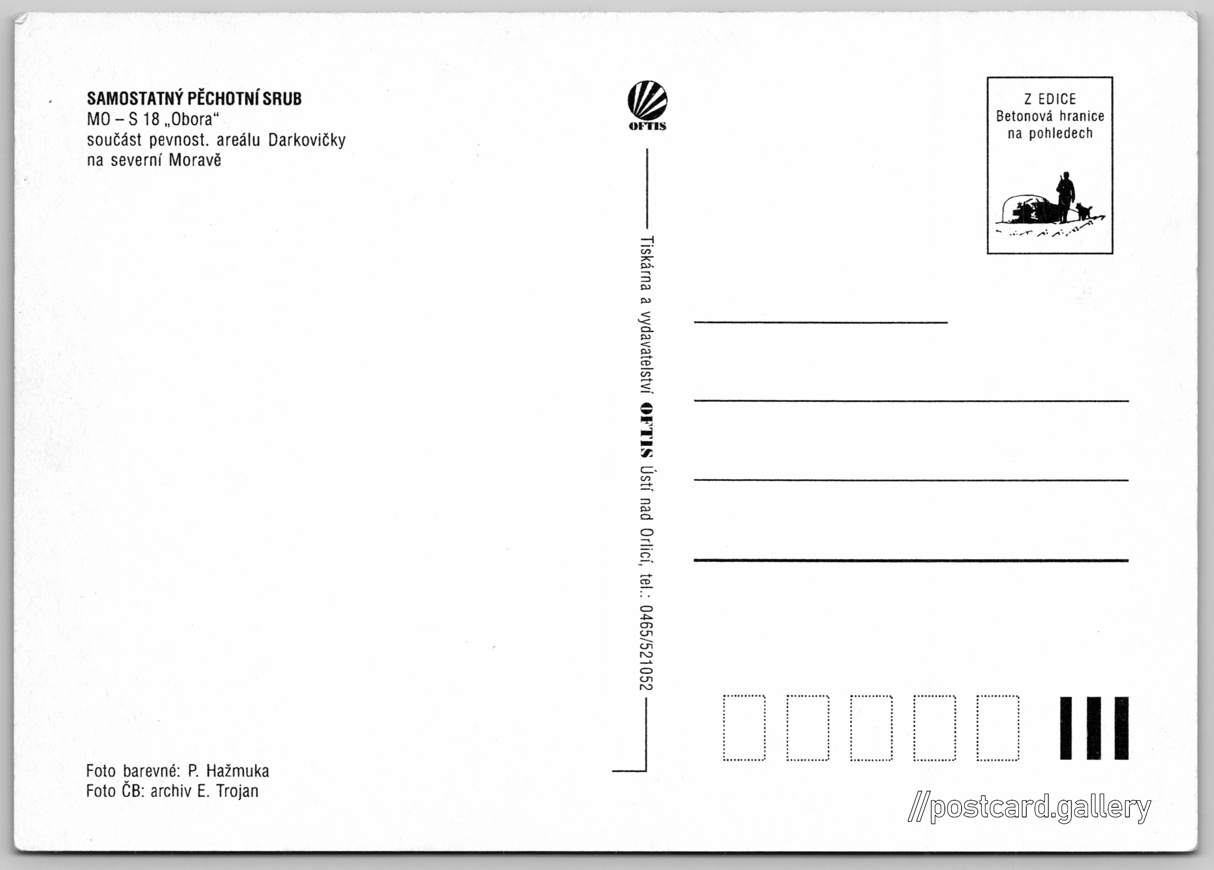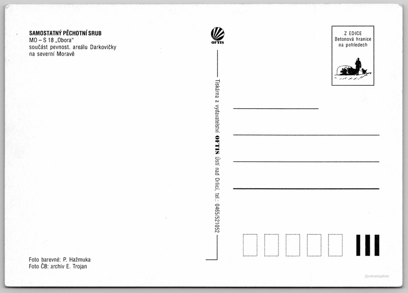 Samostatný pěchotní srub MO-S 18 Pokud chcete vidět pohlednice ve vyšším rozlišení nebo zobrazovat jejich zadní stranu, tak se prosím nejdříve přihlašte Přihlásit Zaregistrovat Samostatný pěchotní srub MO-S 18 SAMOSTATNÝ PĚCHOTNÍ SRUBMO-S 18 "Obora"součást pevnost. areálu Darkovičky na severní MoravěFoto ČB: archiv E. TrojanZ EDICE Betonová hranice na pohledech Jazyk tištěného textu na pohlednici: čeština W6FH+J8 Šilheřovice, Czechia ukázat na mapě Vydavatel: OFTIS Ústí nad Orlicí (Česko) Datum vydání není známo Pomozte nám odhadnout datum vzniku pohlednice Velikost (š x v) a tvar pohlednice: 148 x 105 mm (5.83" x 4.13"), obdélník Osoby spjaté s touto pohlednicí: P. Hažmuka(Autor fotografie) Čistá pohlednice (neprošlá poštou) DiskuseVložit příspěvek Přidat novou složku ... Spravovat složky ...