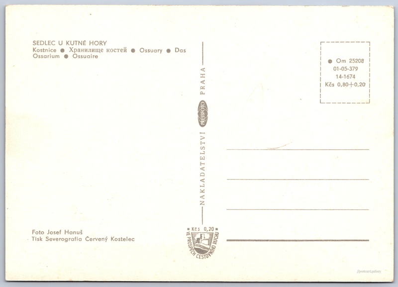 Sedlec u Kutné Hory, kostnice Pokud chcete vidět pohlednice ve vyšším rozlišení nebo zobrazovat jejich zadní stranu, tak se prosím nejdříve přihlašte Přihlásit Zaregistrovat SEDLEC U KUTNÉ HORY- Kostnice- Хранилище костей- Ossuary- Das Ossarium- Ossuaire Jazyky tištěného textu na pohlednici: čeština, ruština, angličtina, němčina, francouzština, francouzština Kostnice Sedlec, Muzeum, Kutná Hora - Sedlec, Česko ukázat na mapě V blízkém okolí místa zobrazeného na pohlednici lze najít 22 jiných pohlednic. Zobrazit blízké pohlednice Vydavatel: PressFoto Praha (Československo) Rok vydání pohlednice: 1973 Velikost (š x v) a tvar pohlednice: 148 x 105 mm (5.83" x 4.13"), obdélník Osoby spjaté s touto pohlednicí: Josef Hanuš(Autor fotografie) Čistá pohlednice (neprošlá poštou) Ceny: Cena pohlednice: 0,80 Kčs (CSK) (+0,20 Kčs přípl. na tur. ruch) Kódy na pohlednici: •Om 25208 01-05-379 14-1674 DiskuseVložit příspěvek Přidat novou složku ... Spravovat složky ...
