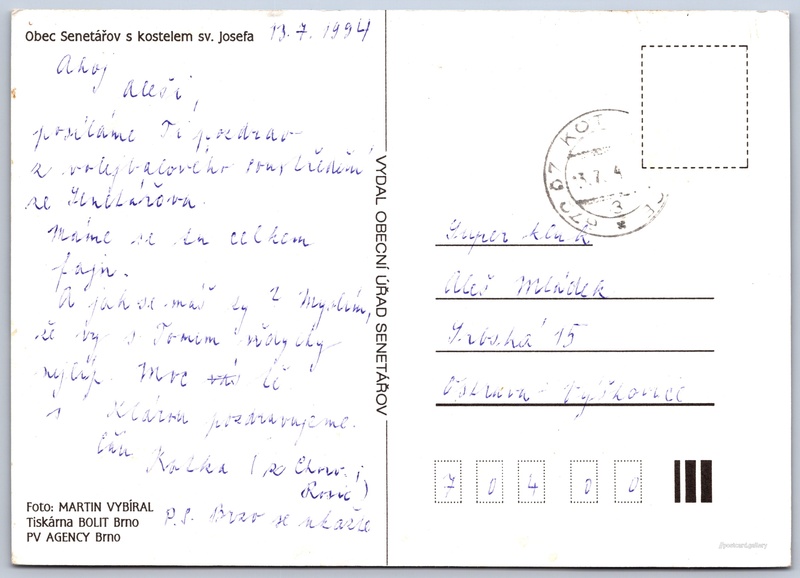 Senetářov, kostel sv. Jakuba Pokud chcete vidět pohlednice ve vyšším rozlišení nebo zobrazovat jejich zadní stranu, tak se prosím nejdříve přihlašte Přihlásit Zaregistrovat Senetářov Obec Senetářov s kostelem sv. Josefa Jazyk tištěného textu na pohlednici: čeština Kostel sv. Josefa, Kostel, Senetářov 155, Senetářov, Česko ukázat na mapě V blízkém okolí místa zobrazeného na pohlednici lze najít 2 jiné pohlednice. Zobrazit blízké pohlednice Vydavatel: Obecní úřad Senetářov (Česko) Odhadované datum vydání pohlednice: 1991 - 1994 Pomozte nám zpřesnit rok vzniku pohlednice Velikost (š x v) a tvar pohlednice: 147 x 105 mm (5.79" x 4.13"), obdélník Osoby spjaté s touto pohlednicí: Martin Vybíral(Autor fotografie) Prošlá poštou:Datum na razítku: 13.7.1994Datum napsání pohledu: 3.7.1994 DiskuseVložit příspěvek Přidat novou složku ... Spravovat složky ...
